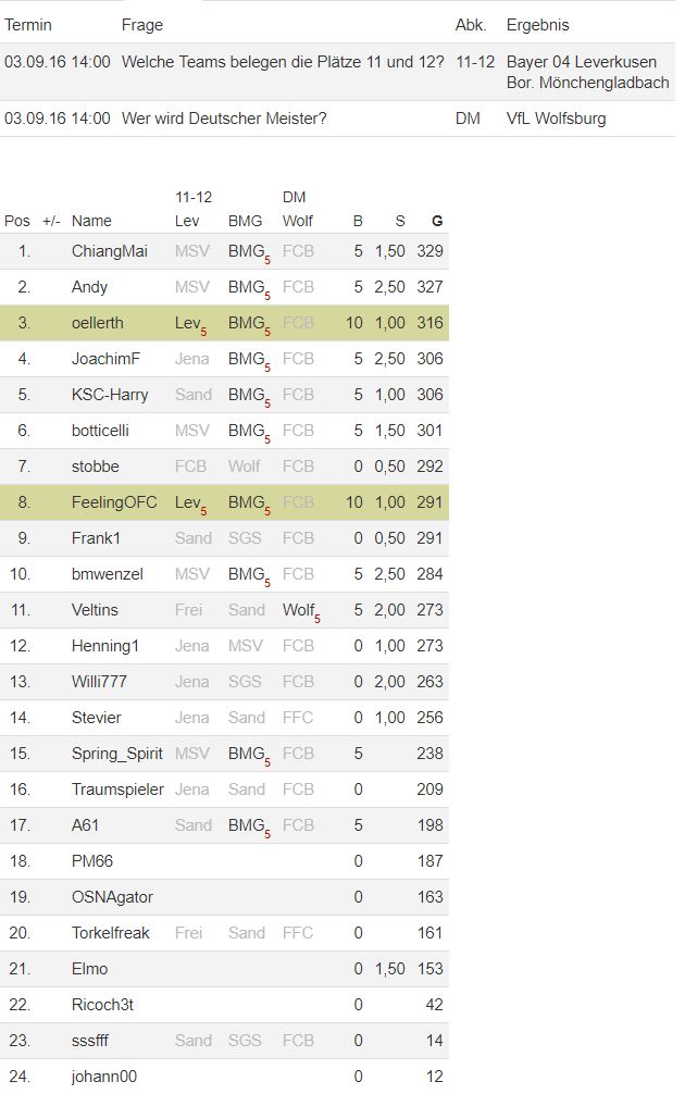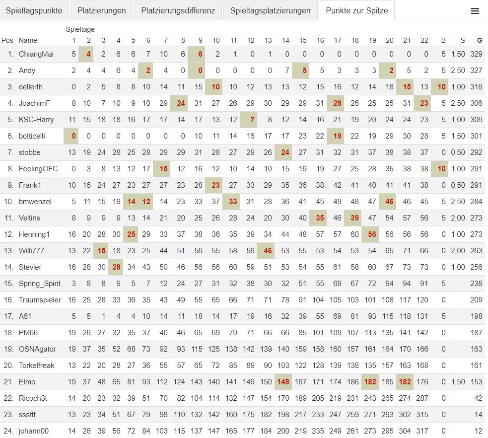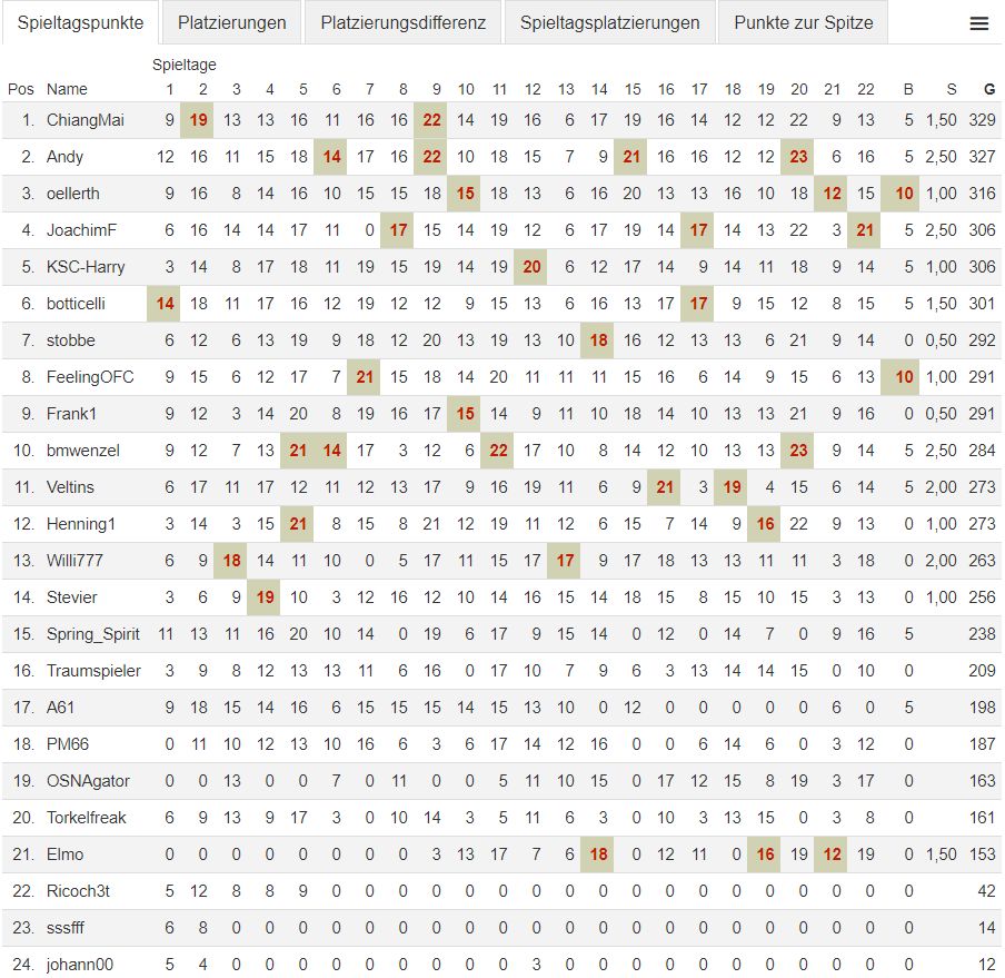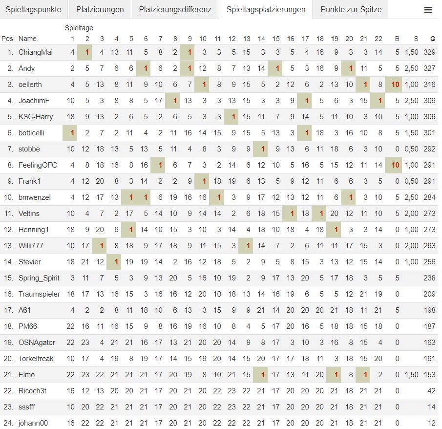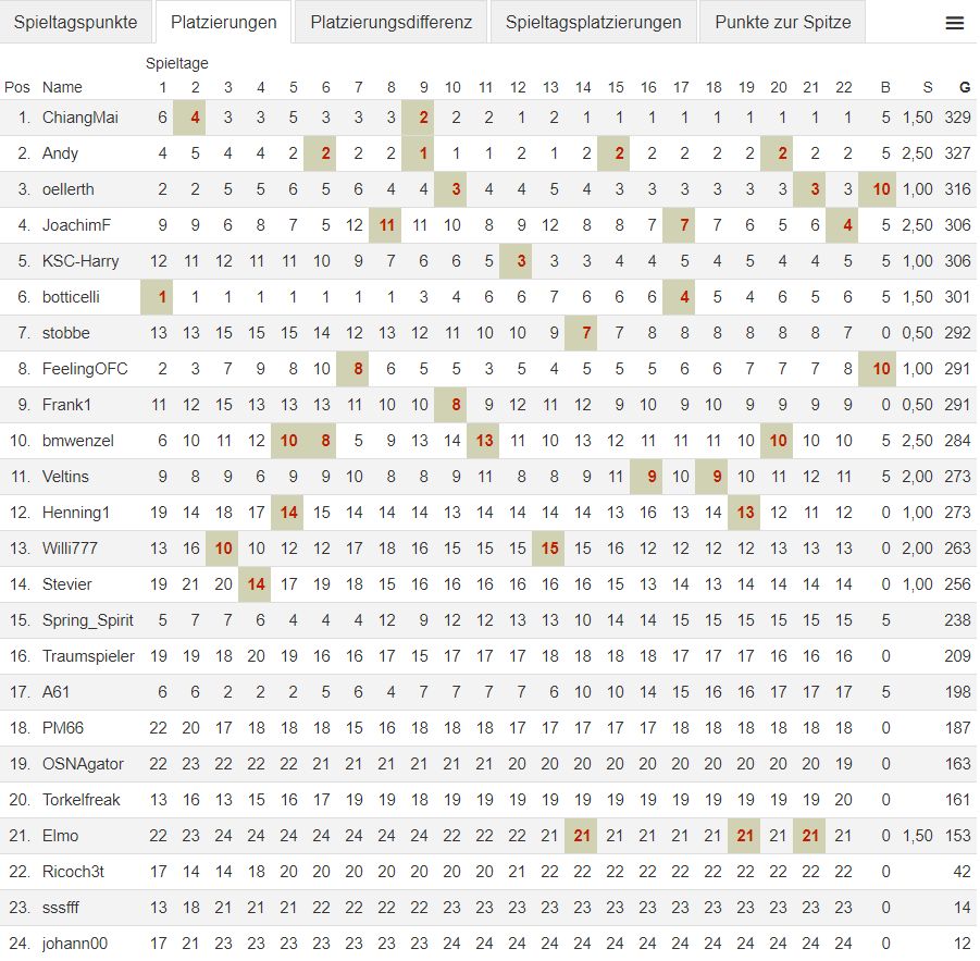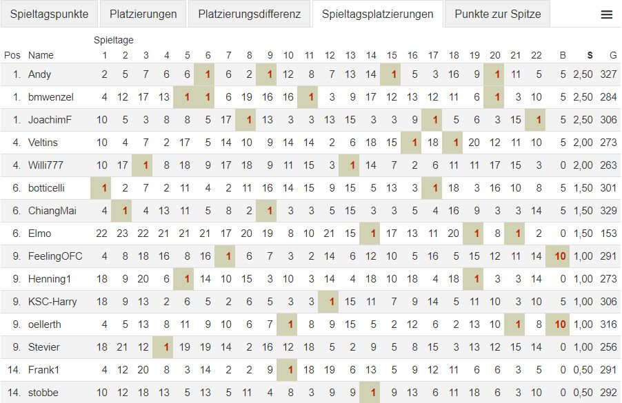 Spieltagplatzierungen (Platzierung nach Siegpunkten)