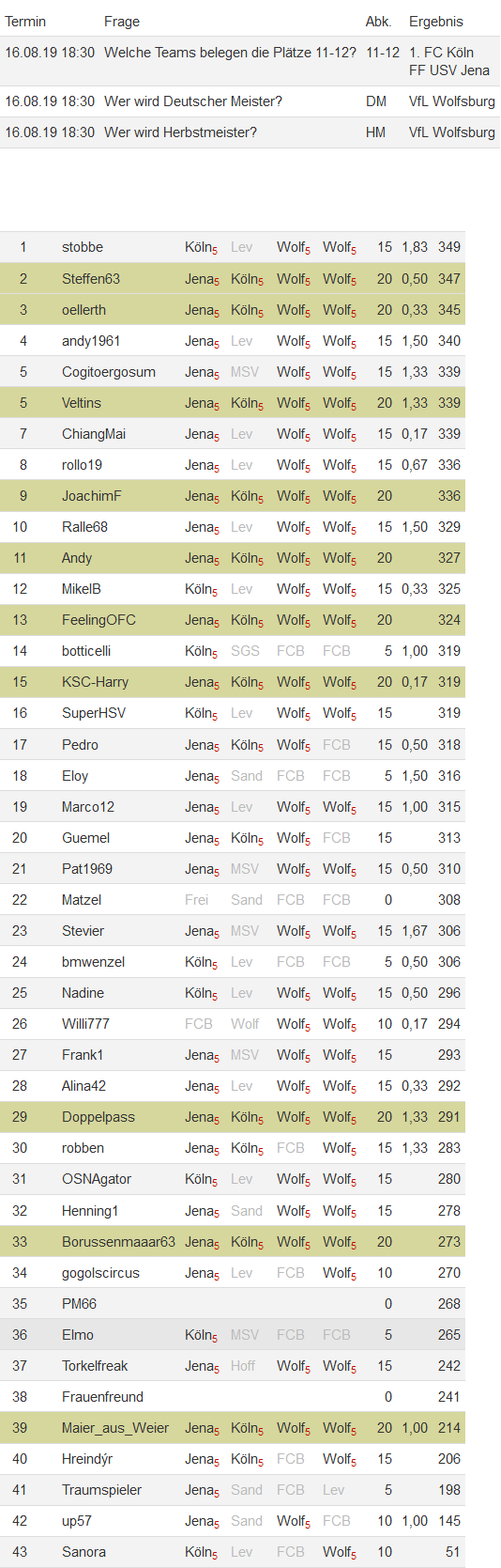 Frauen-Bundesliga-Tippspiel-Statistiken: Saison 2019/20