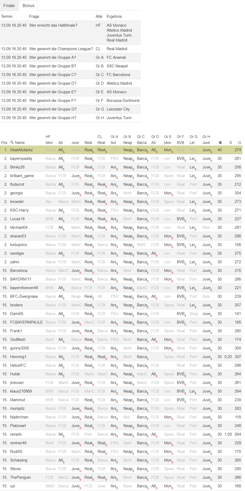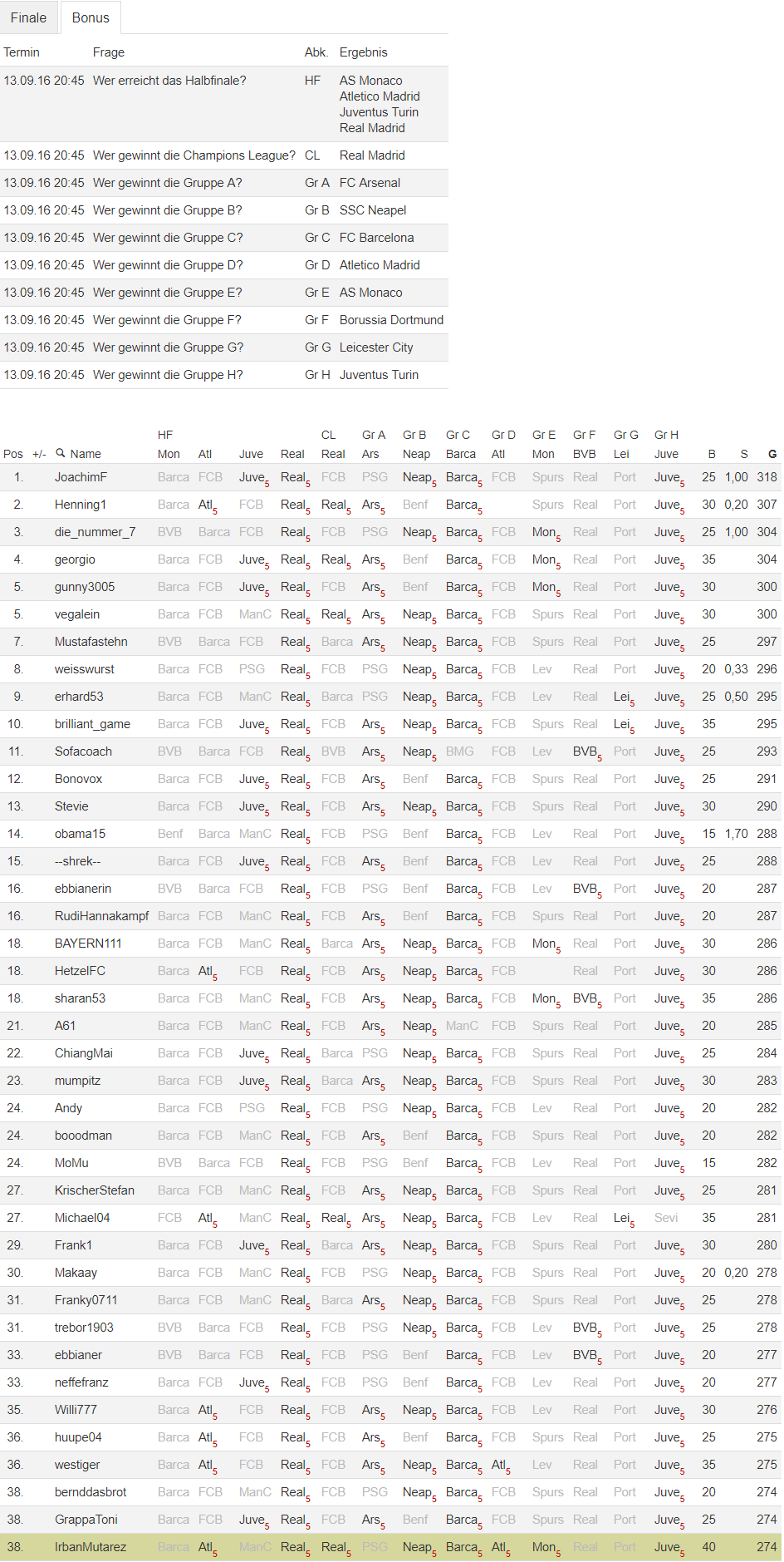 Champions League-Tippspiel-Statistiken: Saison 2016/17