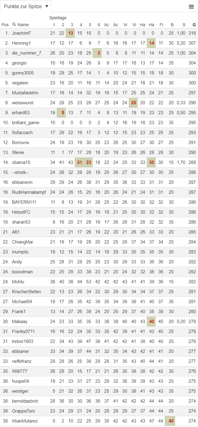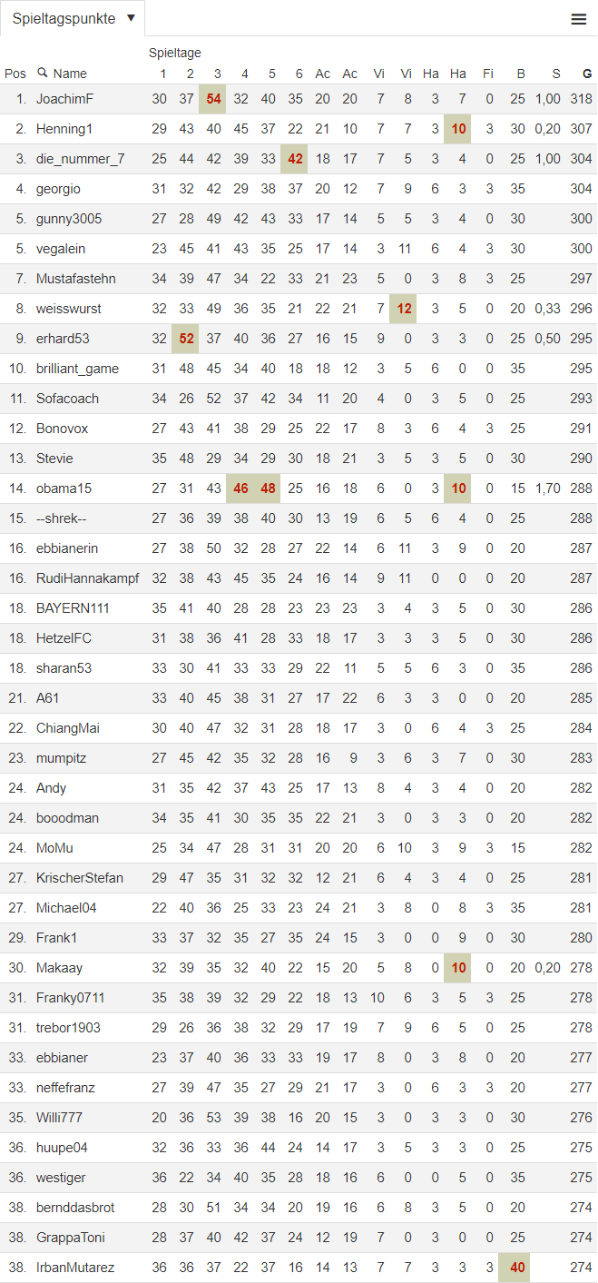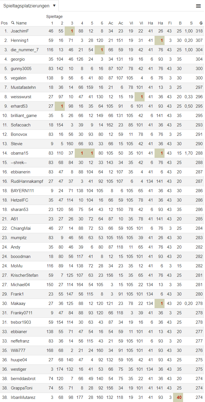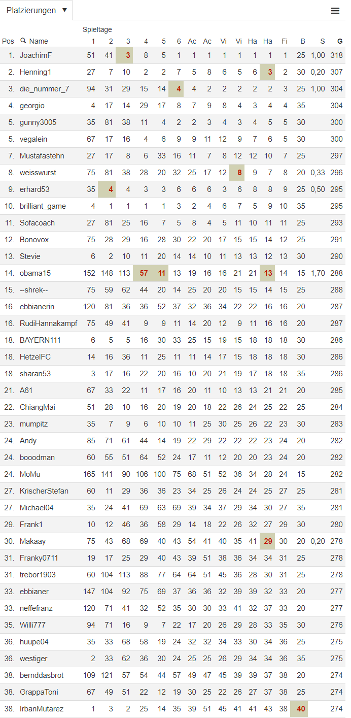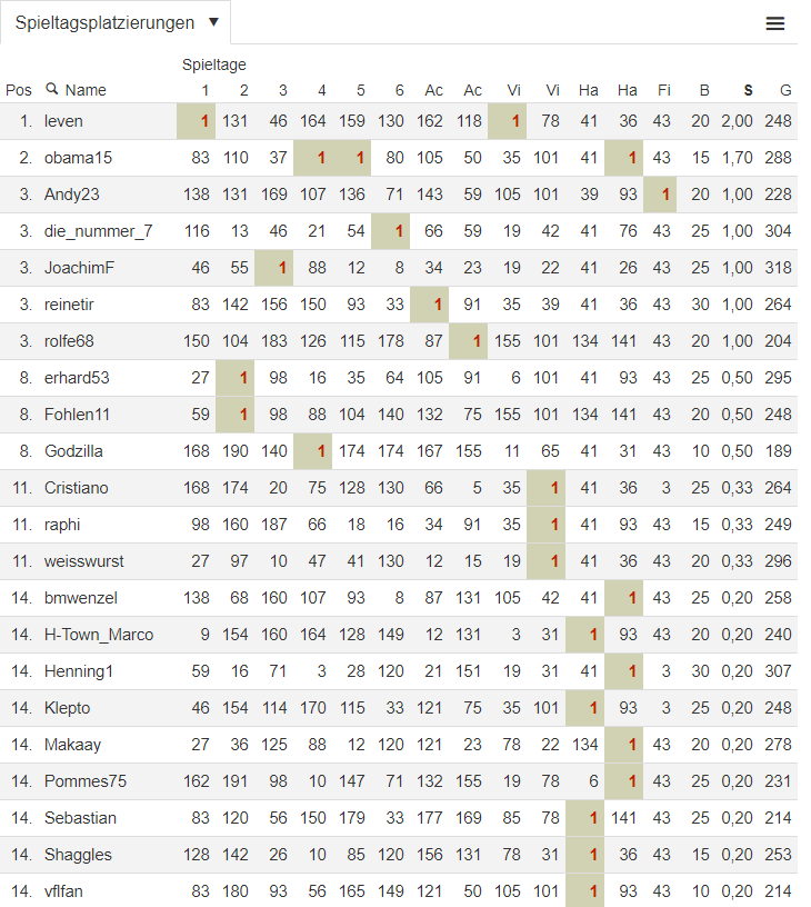 Spieltagplatzierungen (Platzierung nach Siegpunkten)