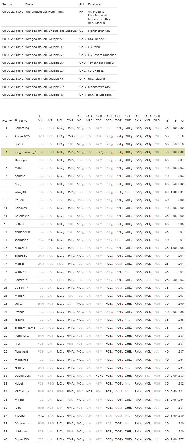 Champions League-Tippspiel-Statistiken: Saison 2022/23
