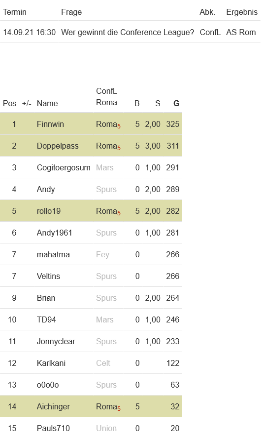 Conference League Tippspiel-Statistiken: Saison 2021/22