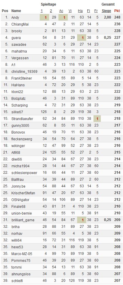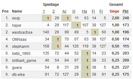 Spieltagplatzierungen (Platzierung nach Siegpunkten)