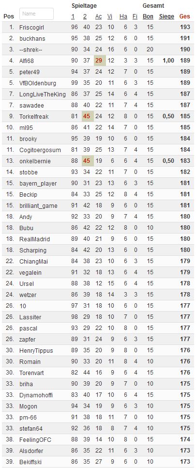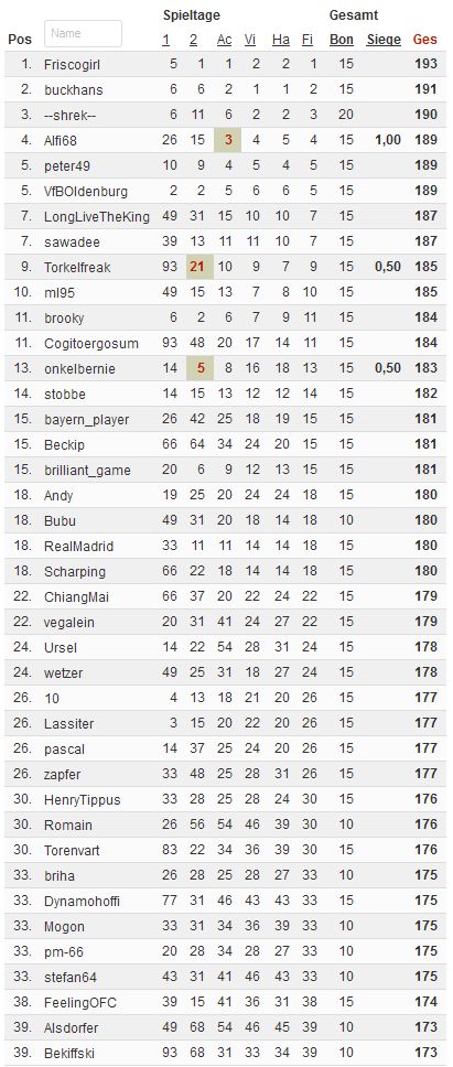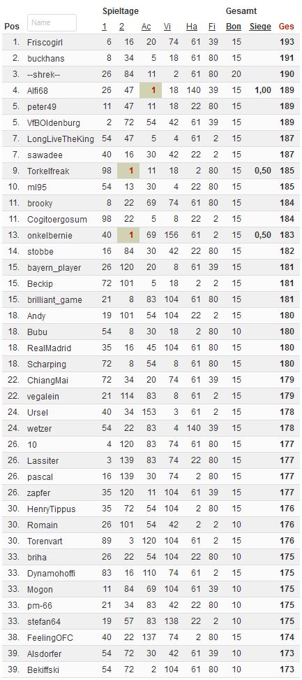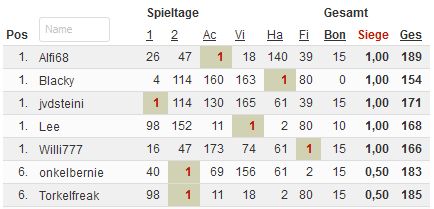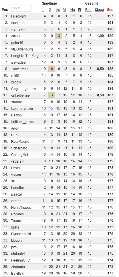 Spieltagplatzierungen (Platzierung nach Siegpunkten)