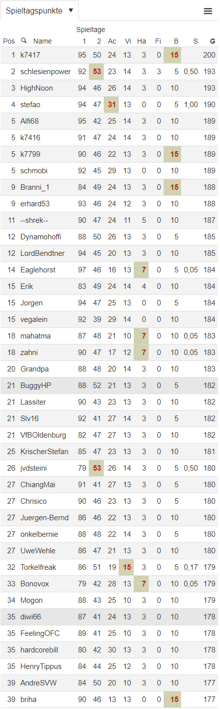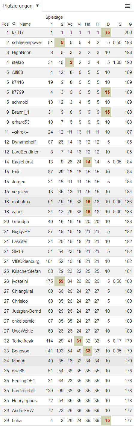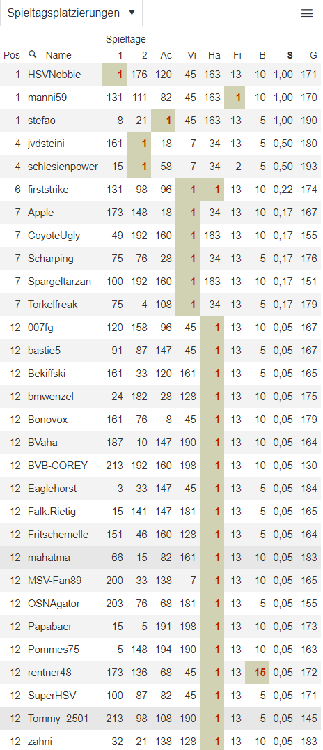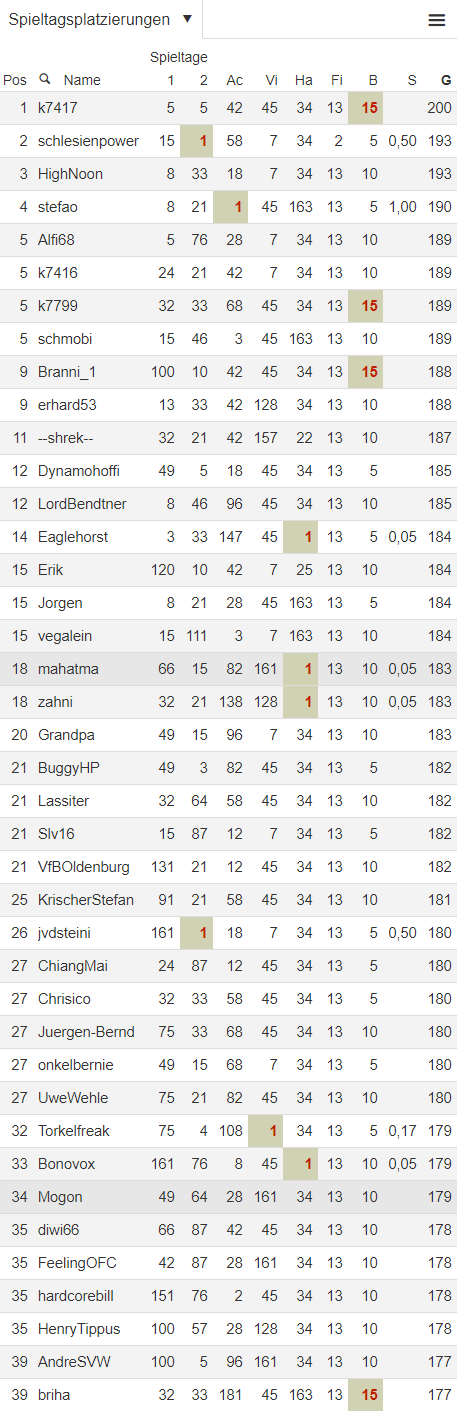Spieltagplatzierungen (Platzierung nach Siegpunkten)