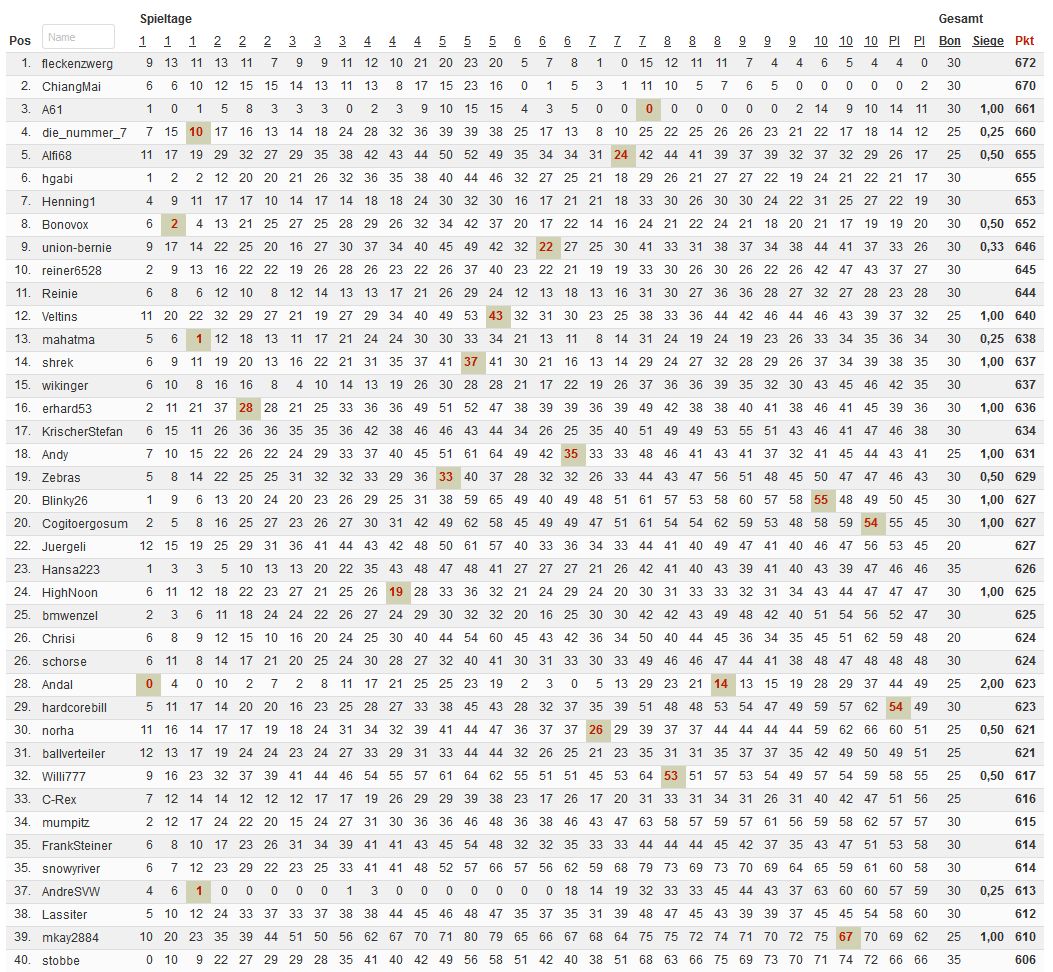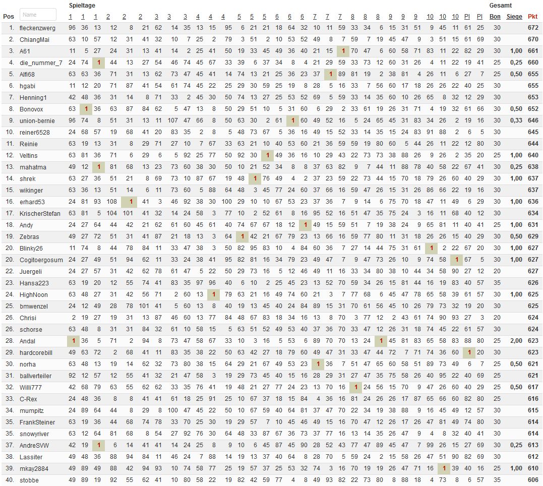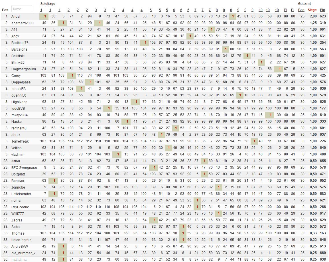 Spieltagplatzierungen (Platzierung nach Siegpunkten)