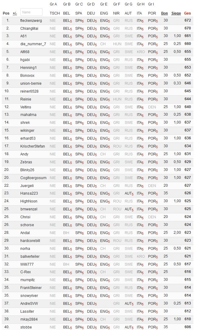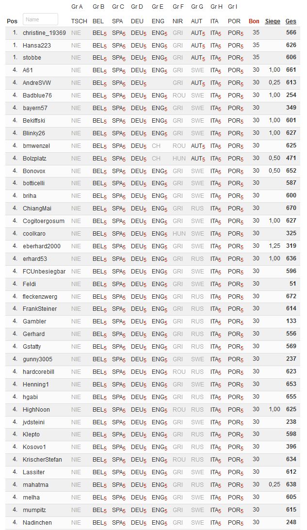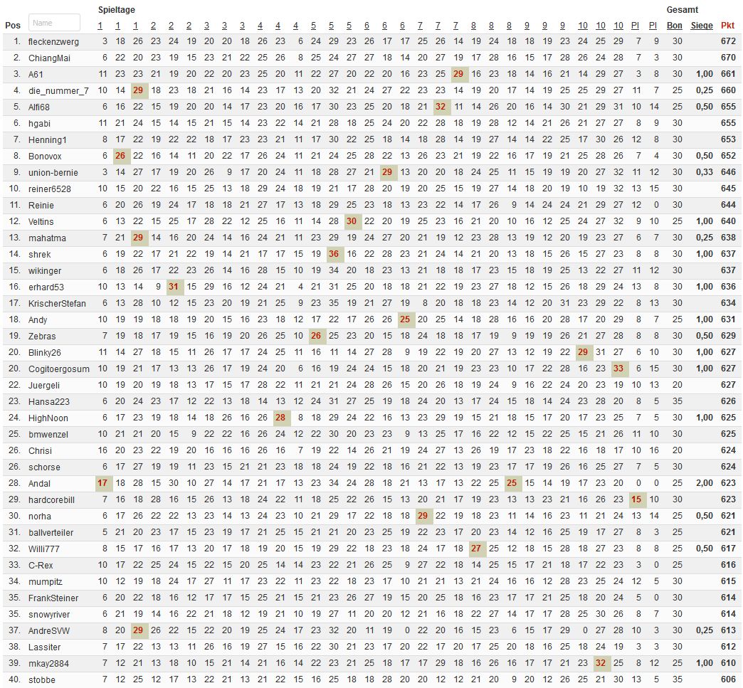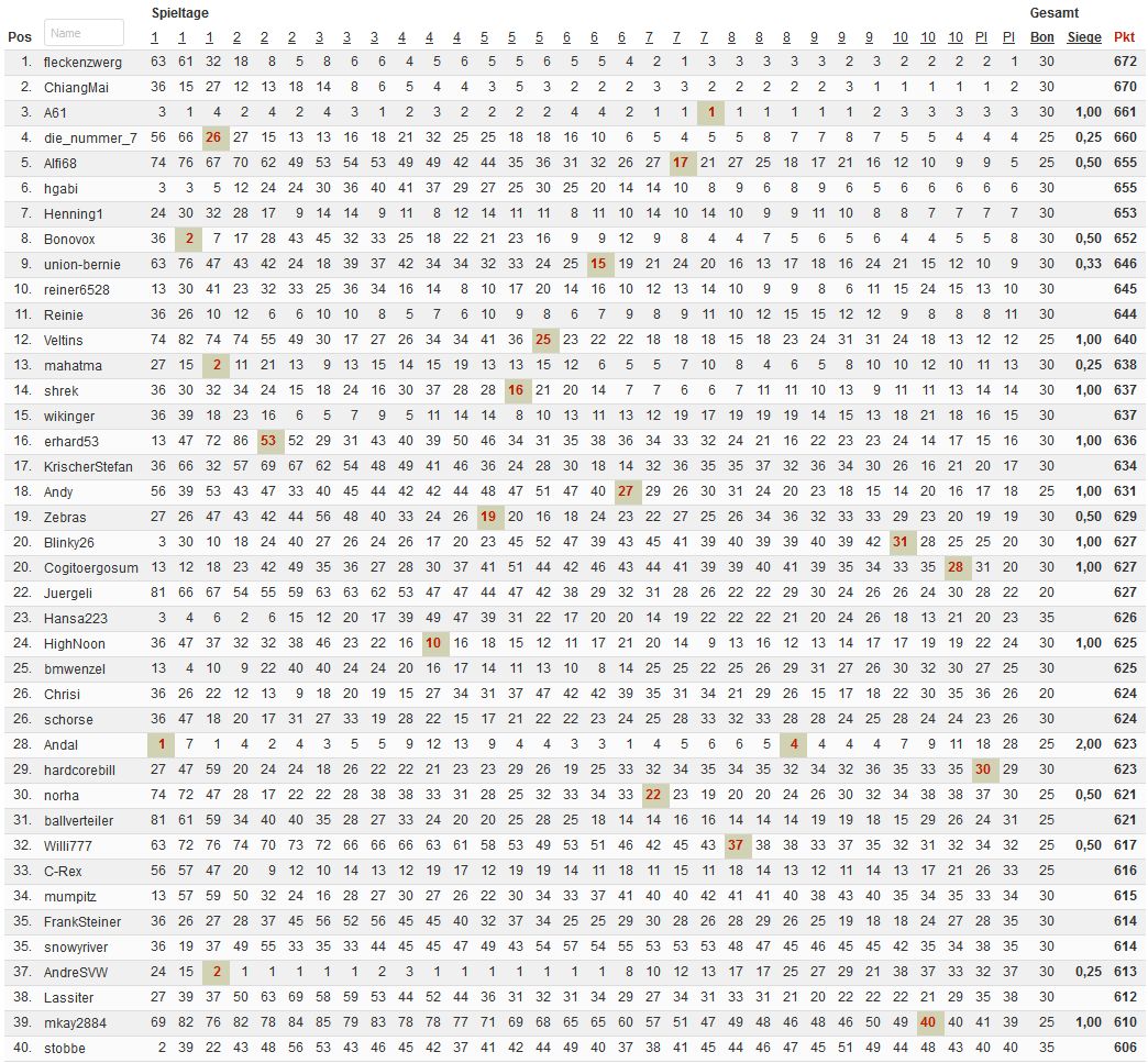 Spieltagplatzierungen (Platzierung nach Siegpunkten)