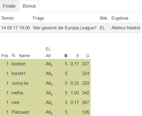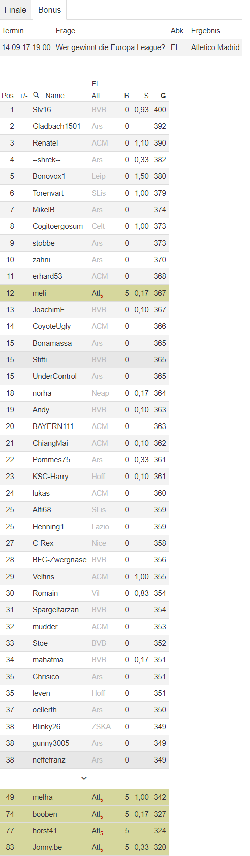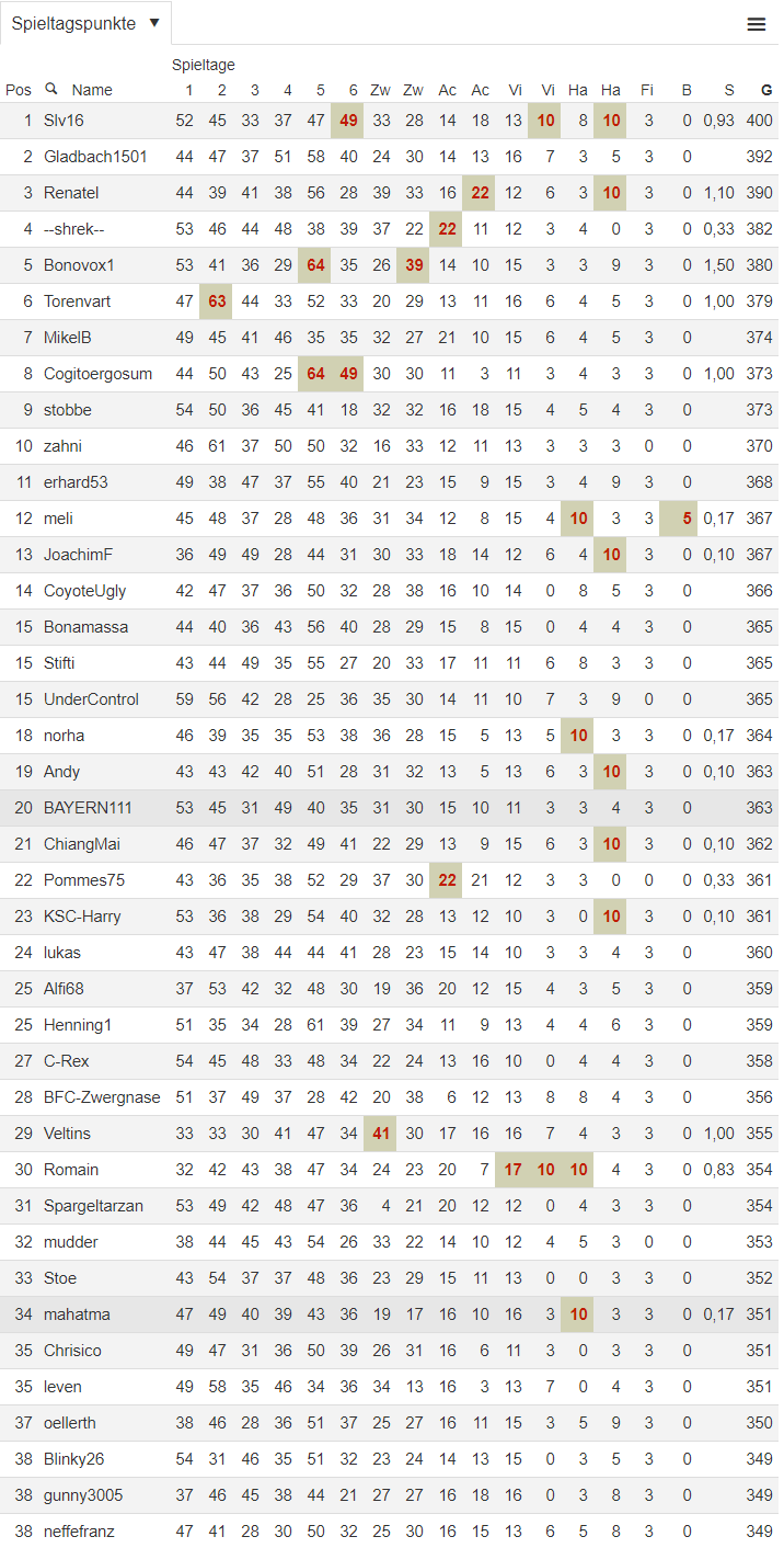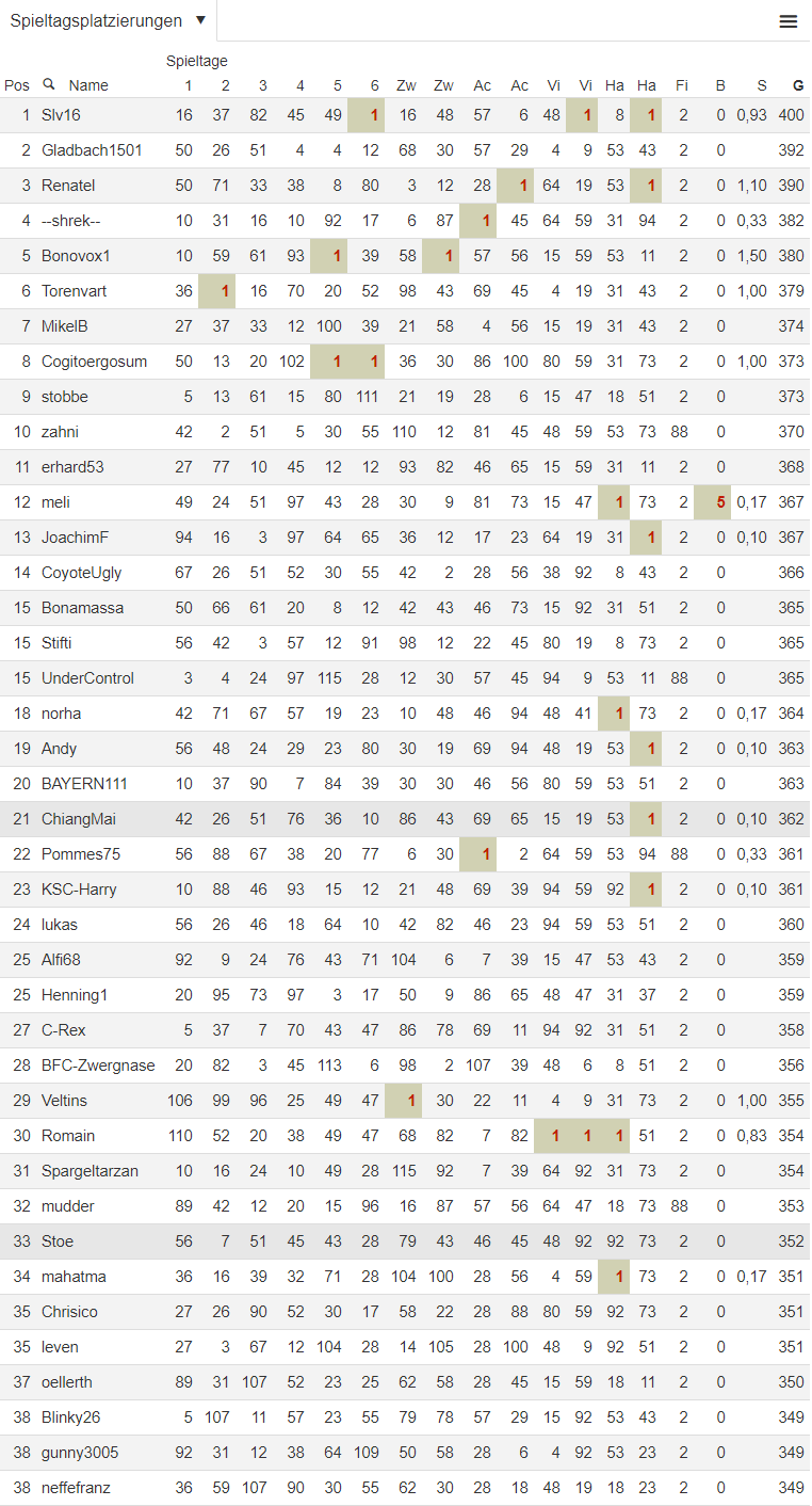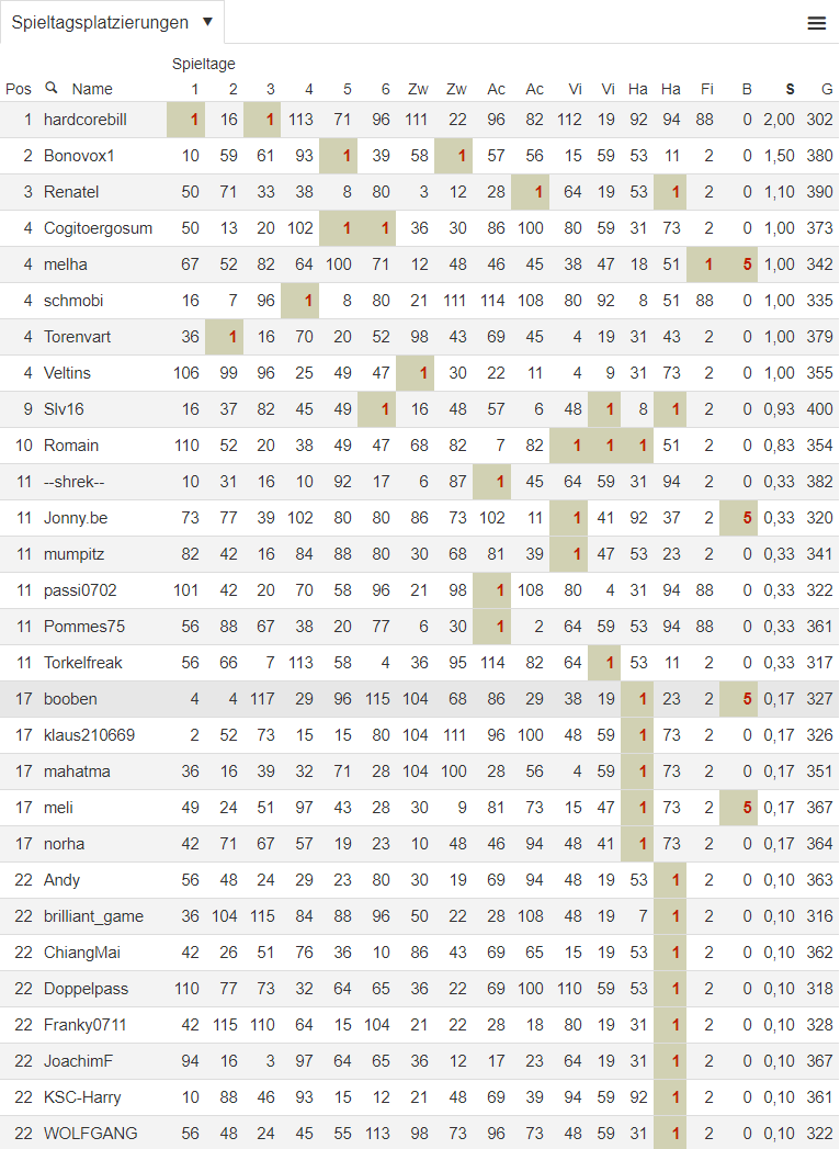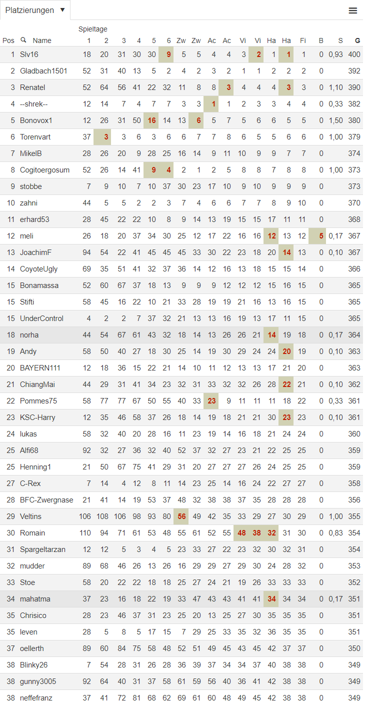 Spieltagplatzierungen (Platzierung nach Siegpunkten)