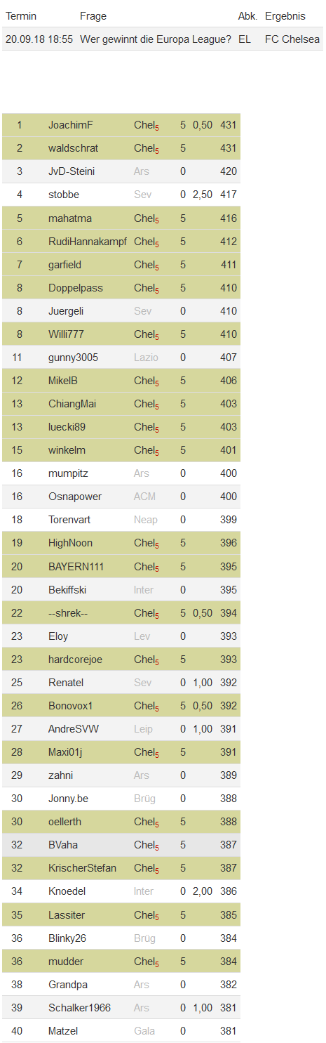 Europa League Tippspiel-Statistiken: Saison 2018/19