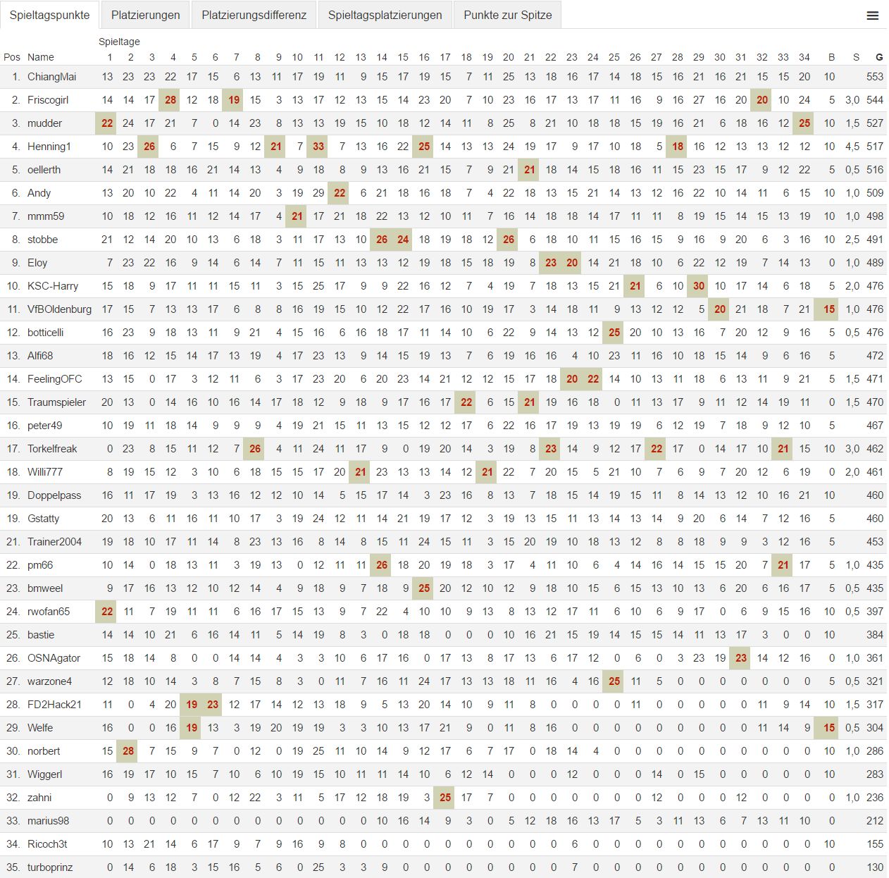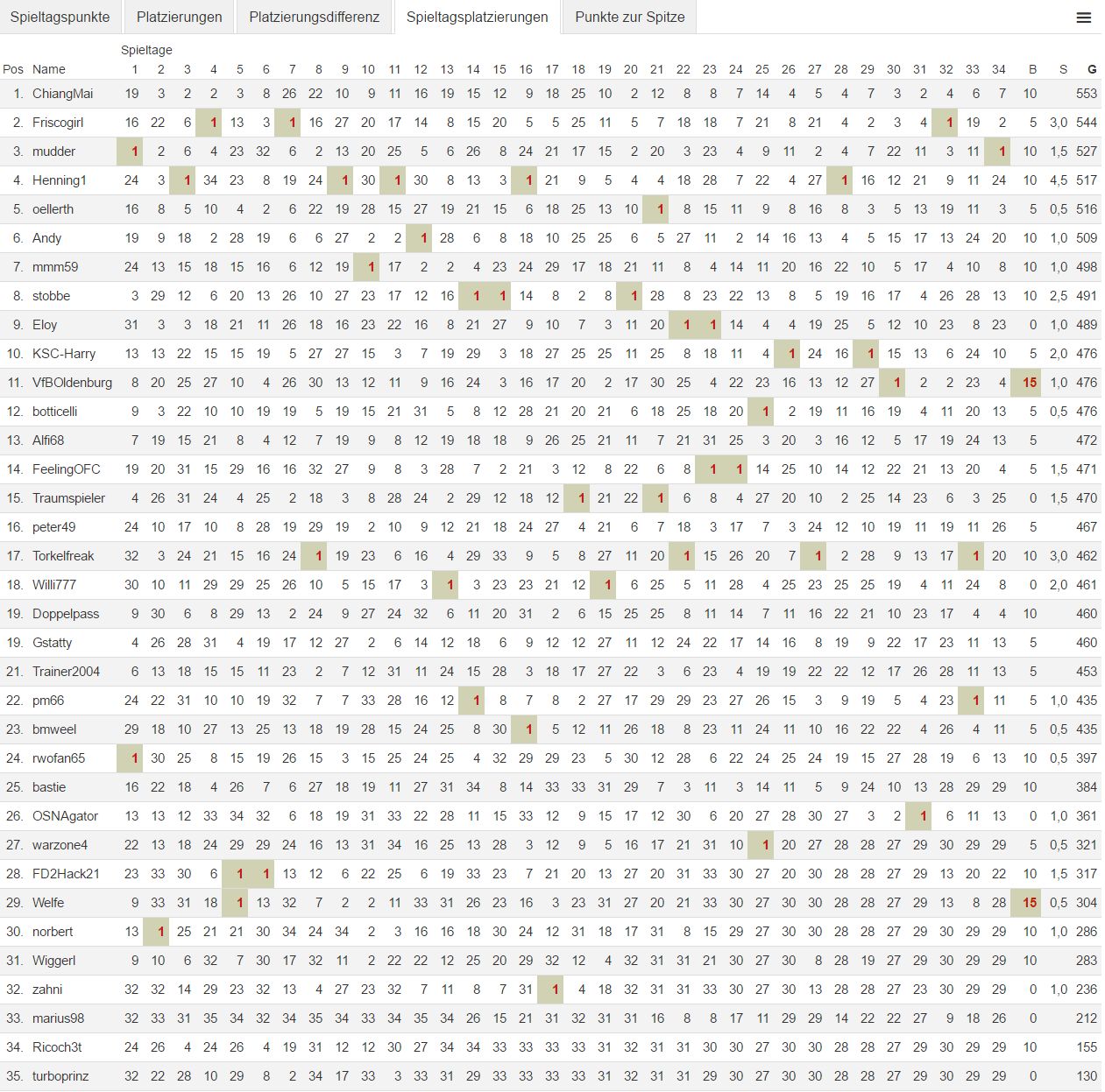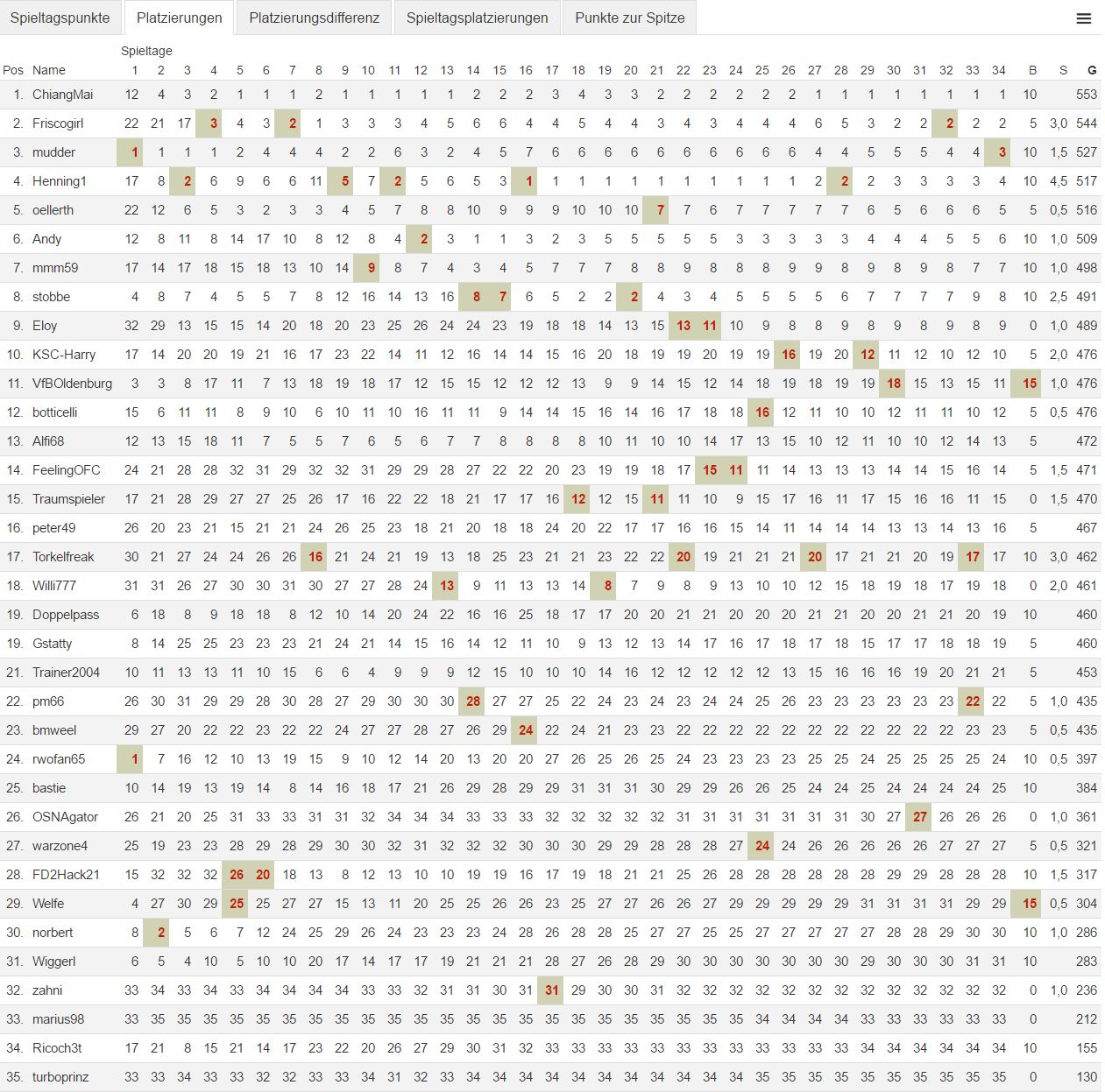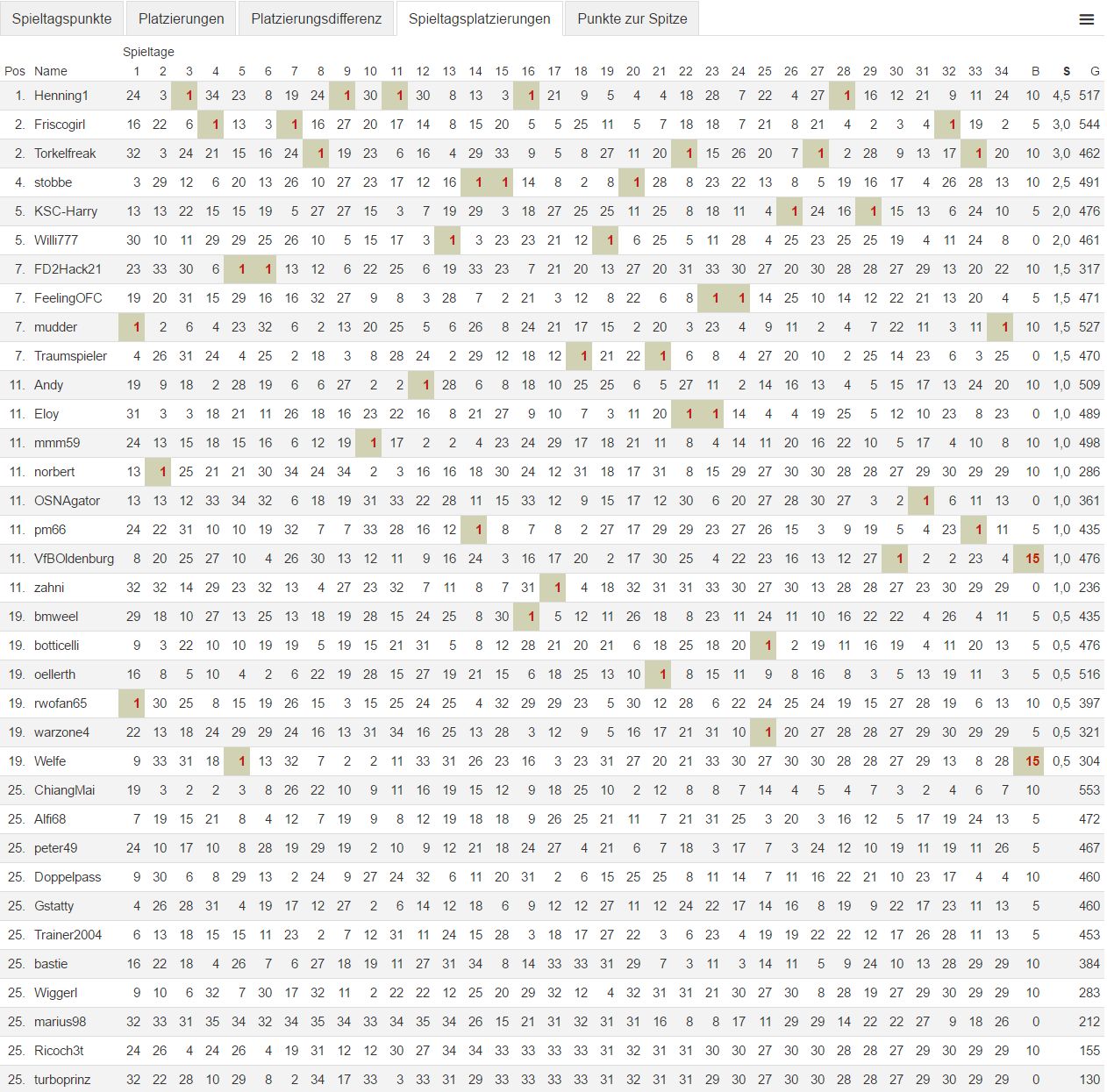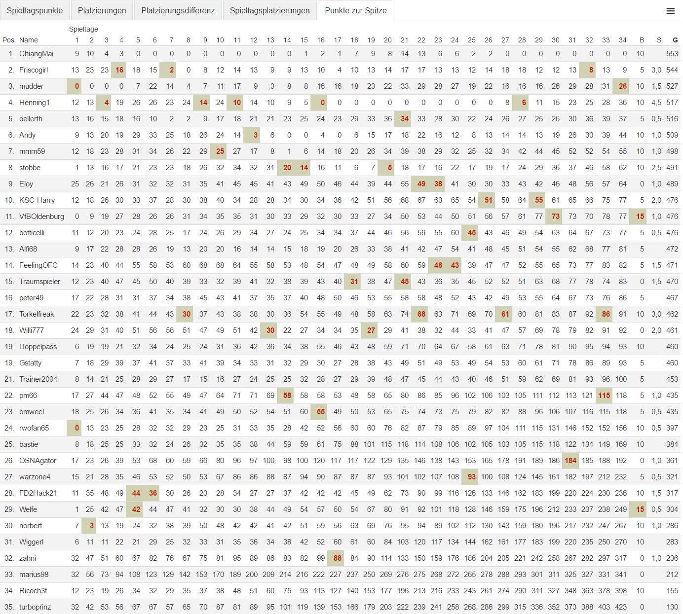 Spieltagplatzierungen (Platzierung nach Siegpunkten)