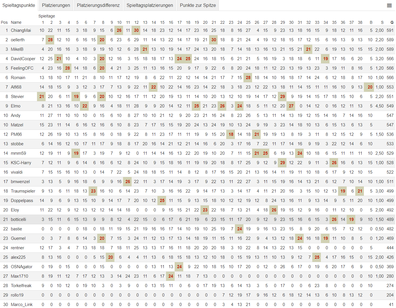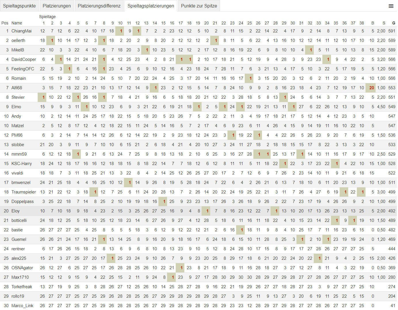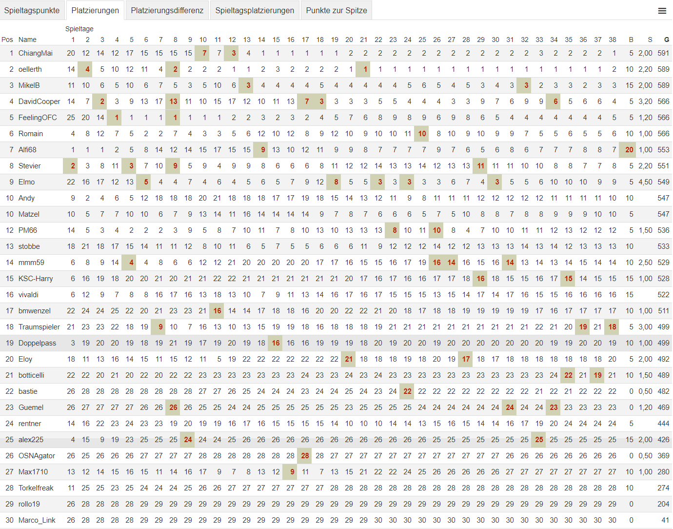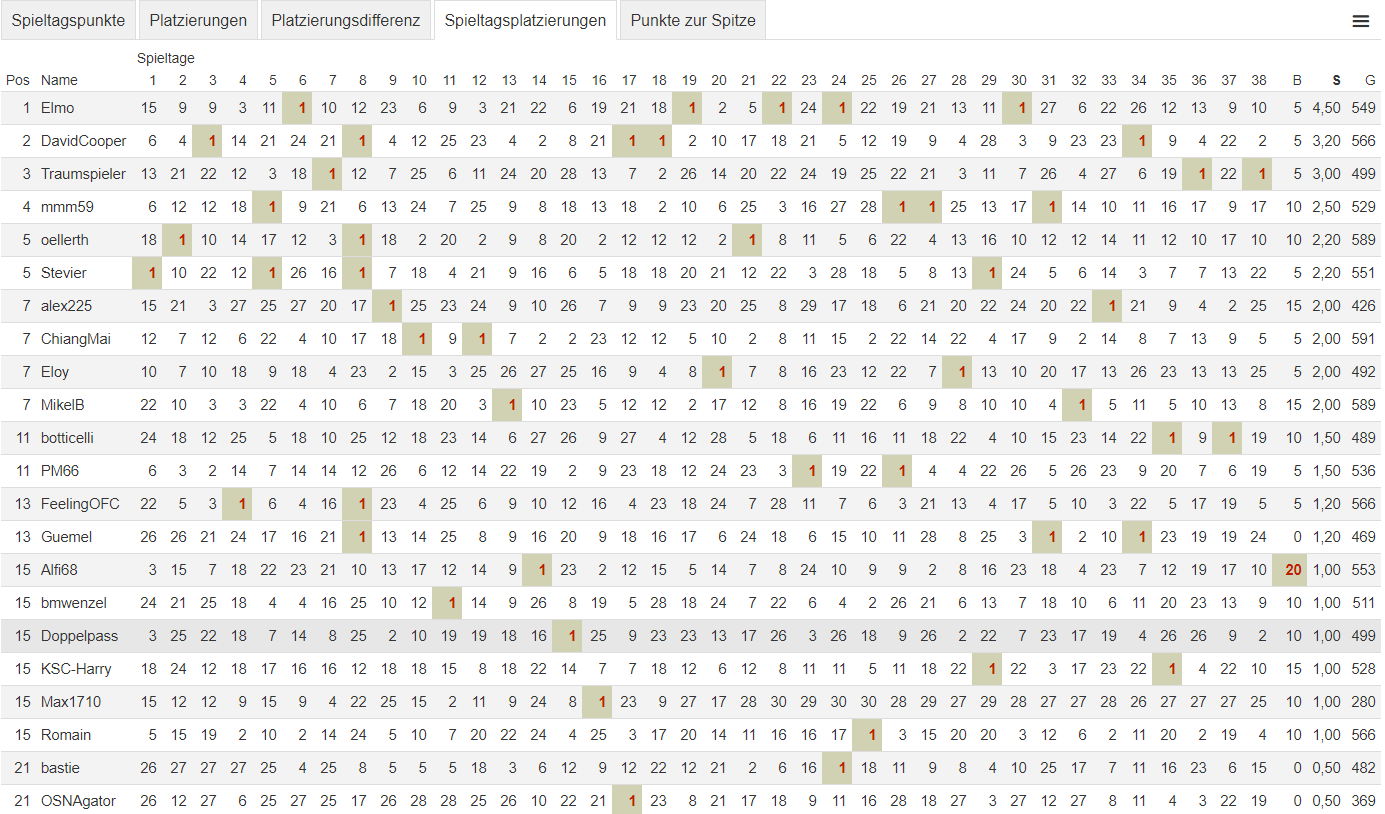 Spieltagplatzierungen (Platzierung nach Siegpunkten)