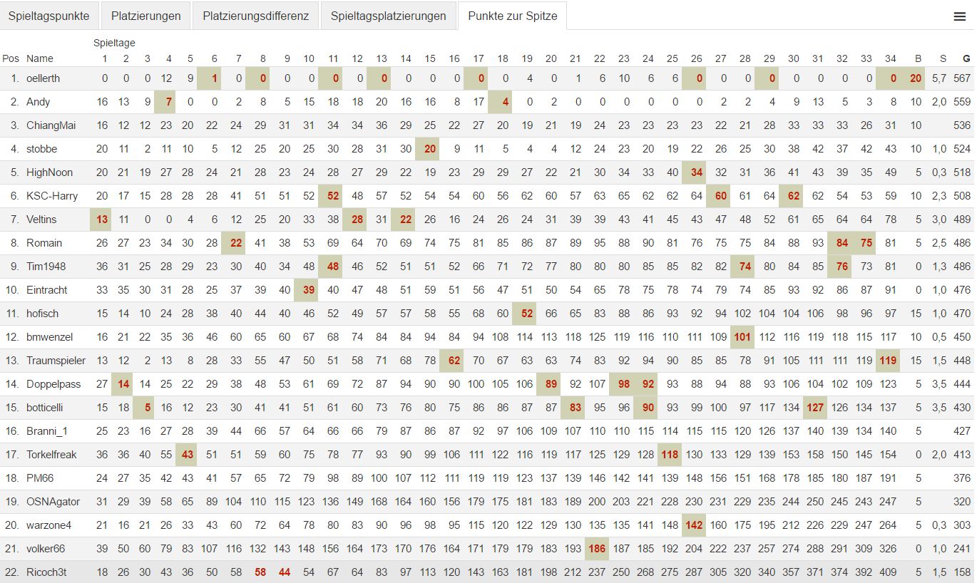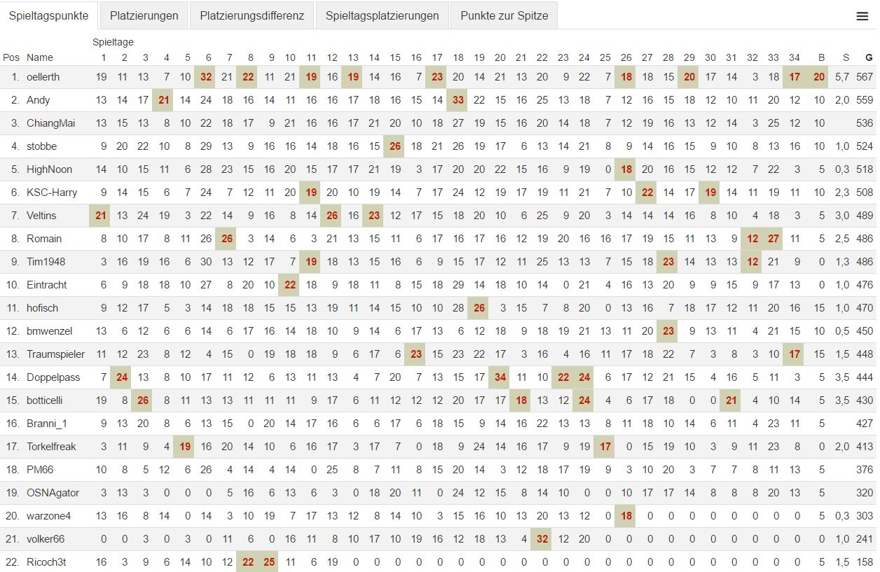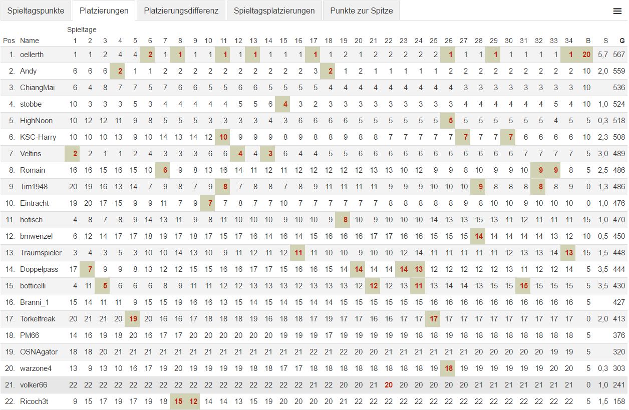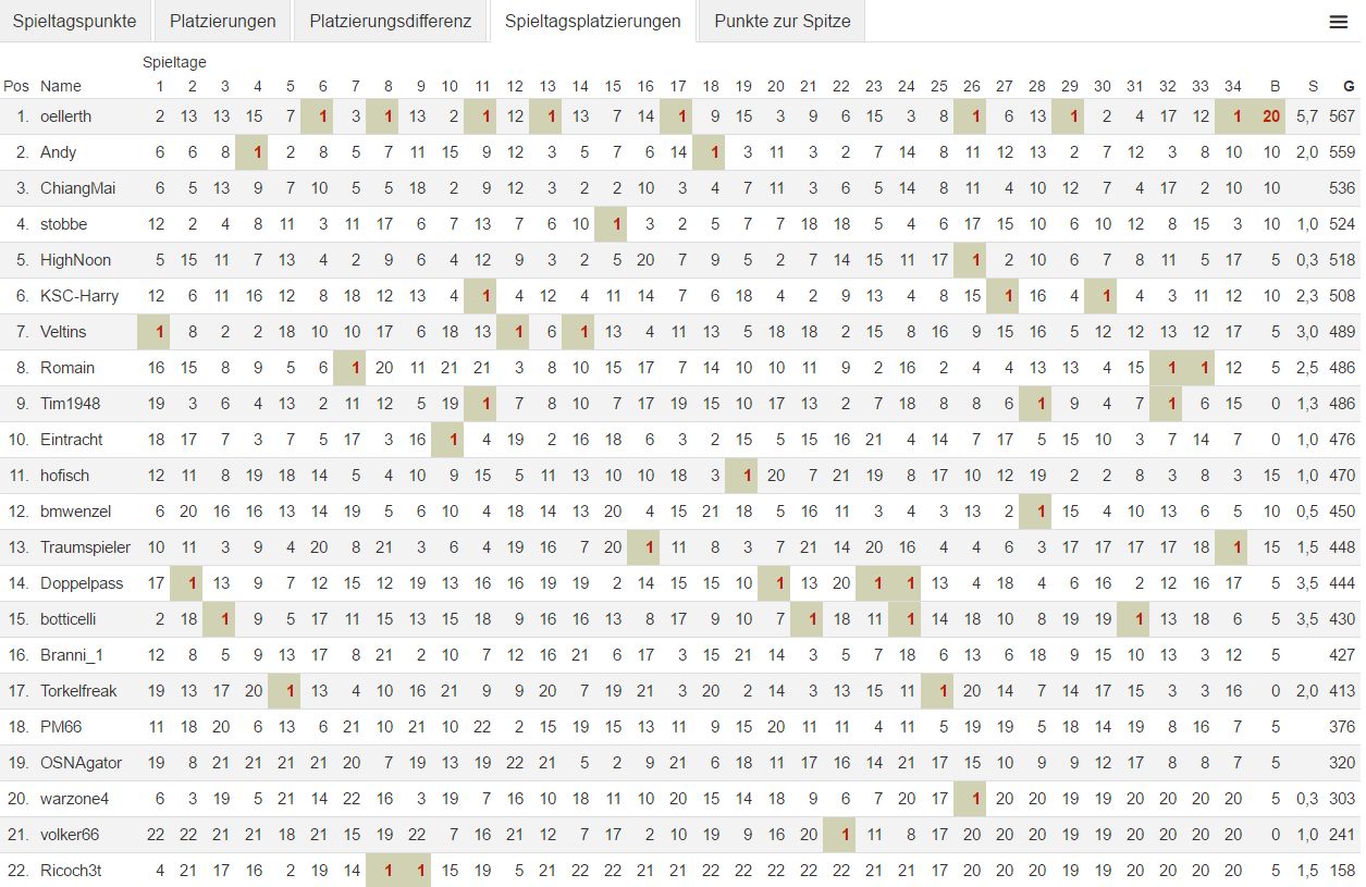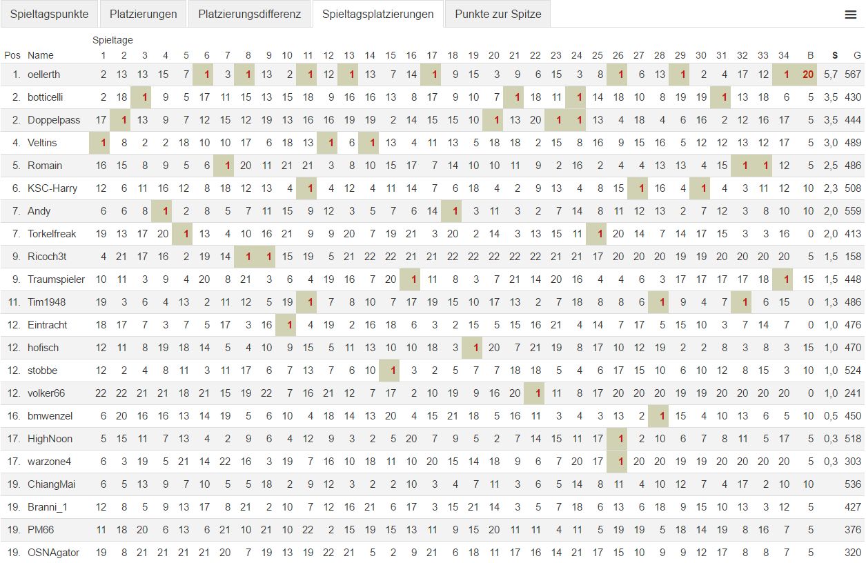 Spieltagplatzierungen (Platzierung nach Siegpunkten)