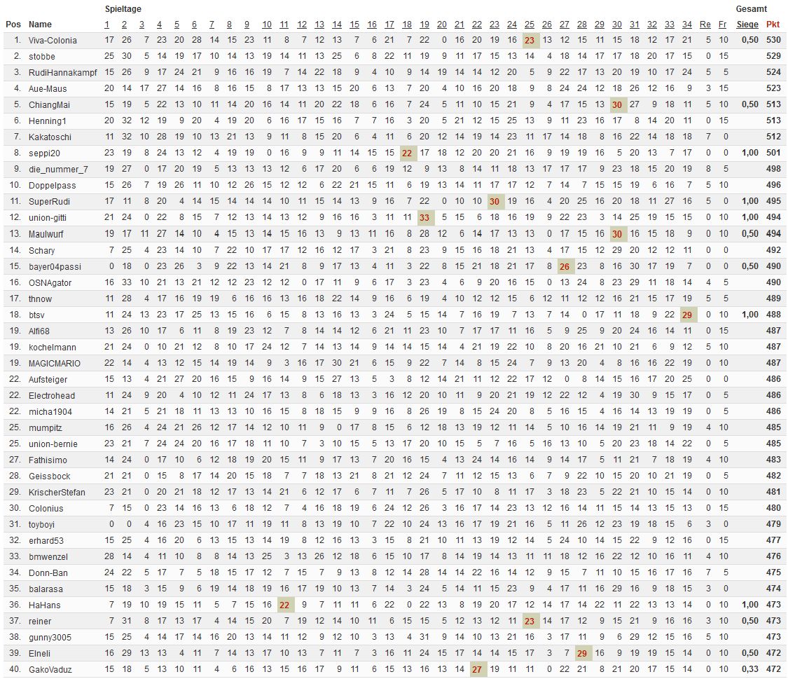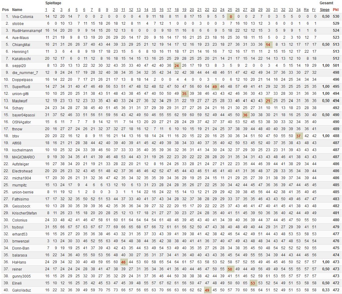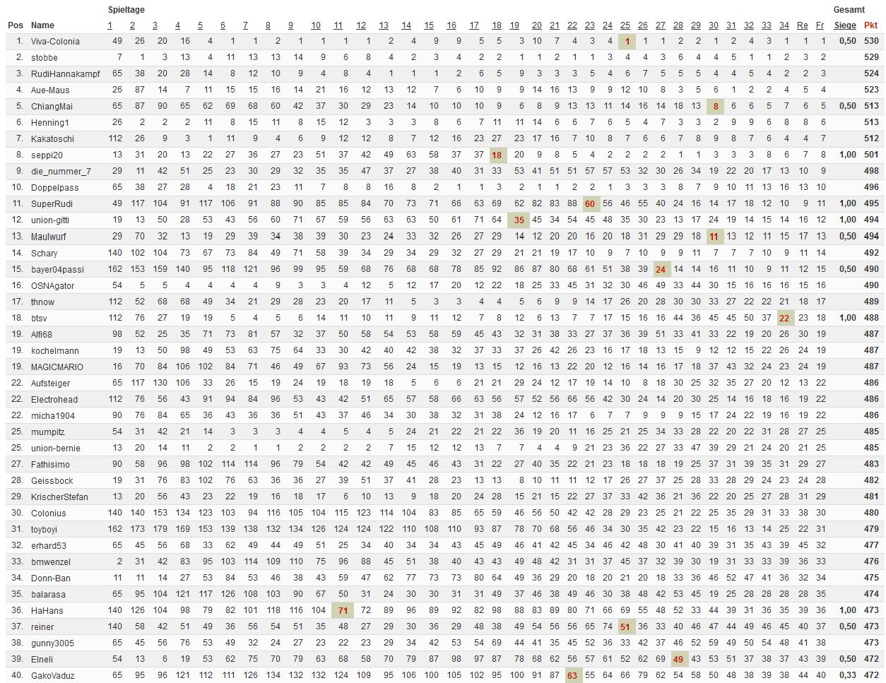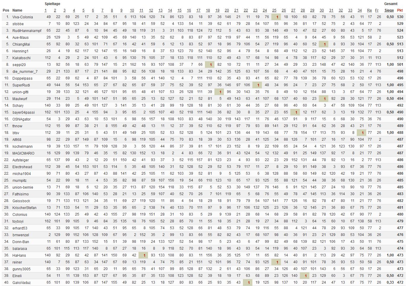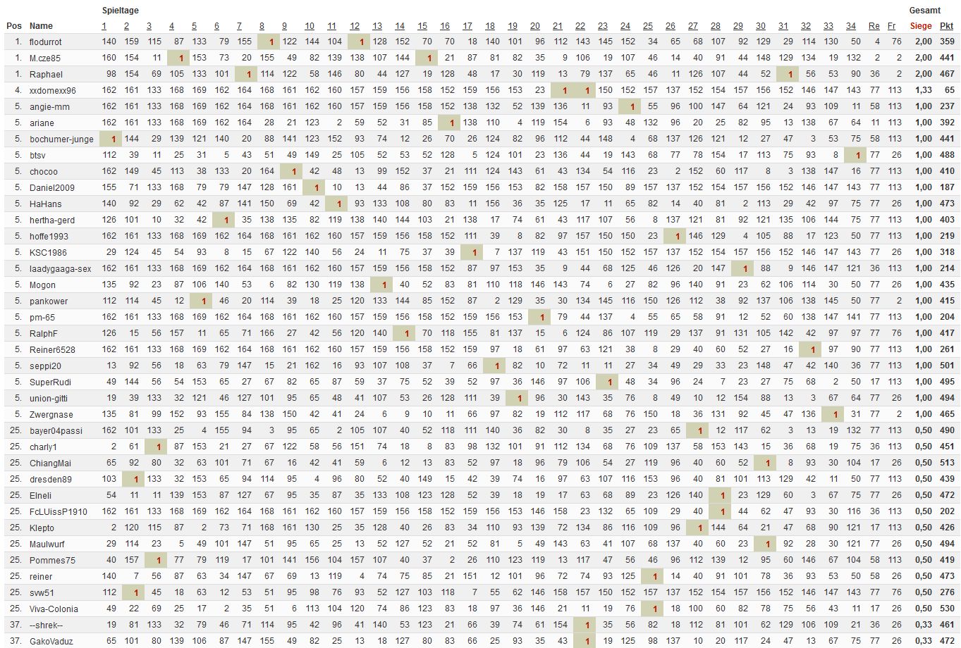 Spieltagplatzierungen (Platzierung nach Siegpunkten)
