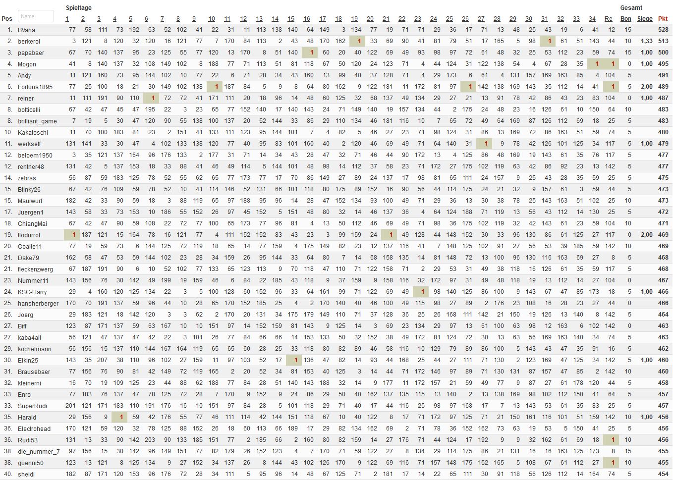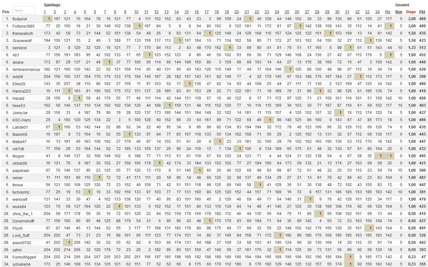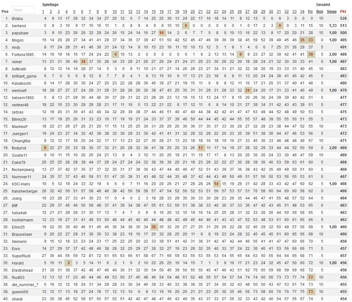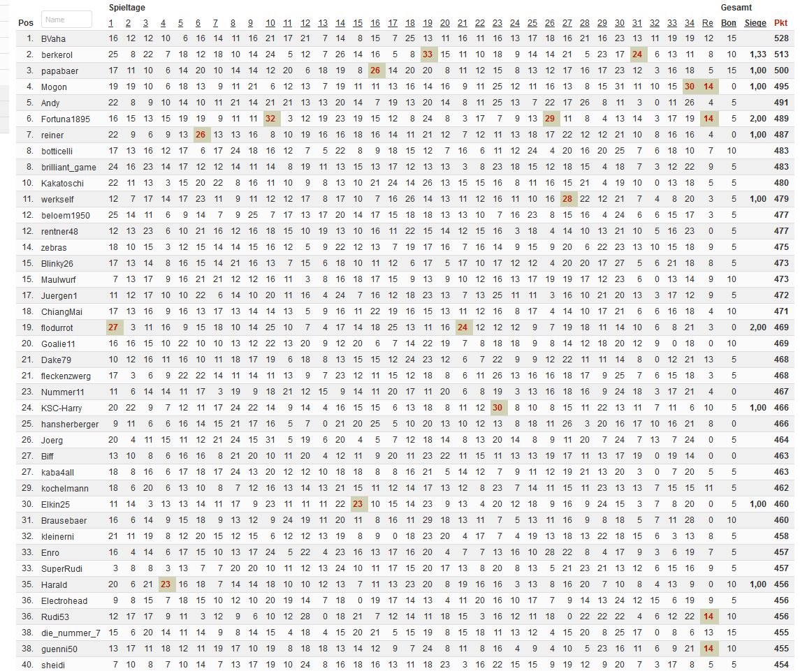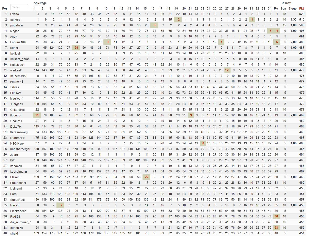 Spieltagplatzierungen (Platzierung nach Siegpunkten)