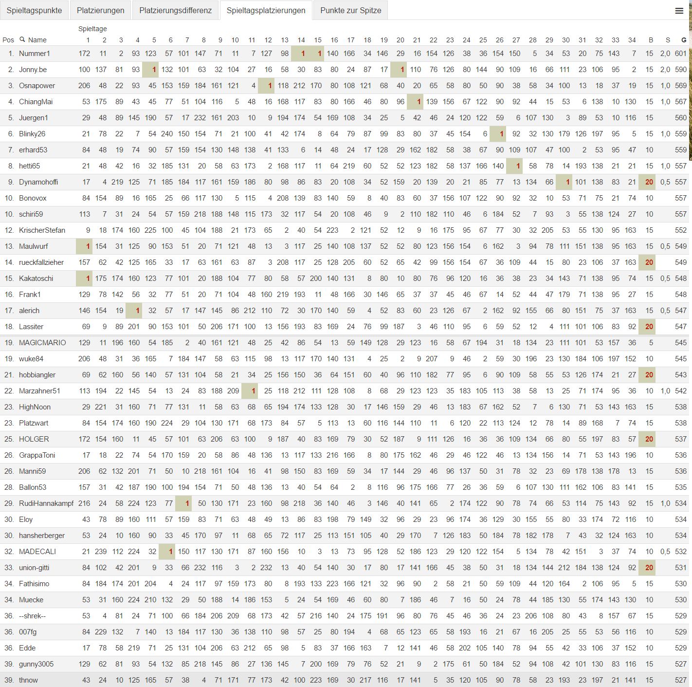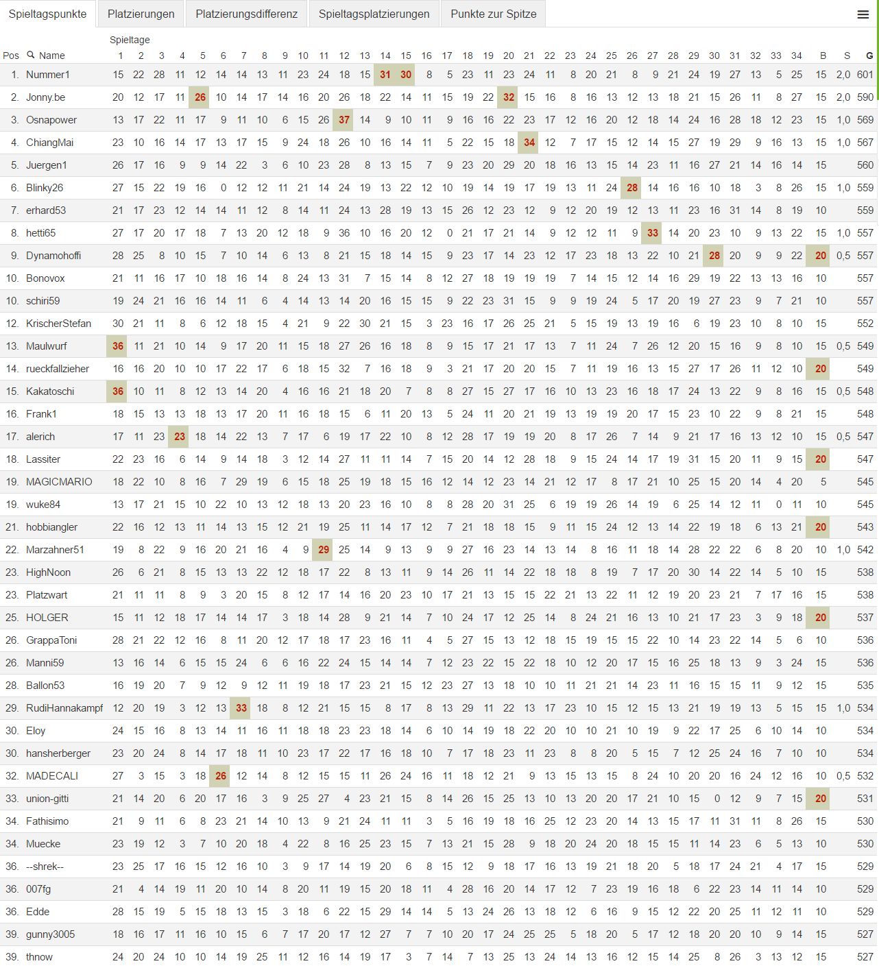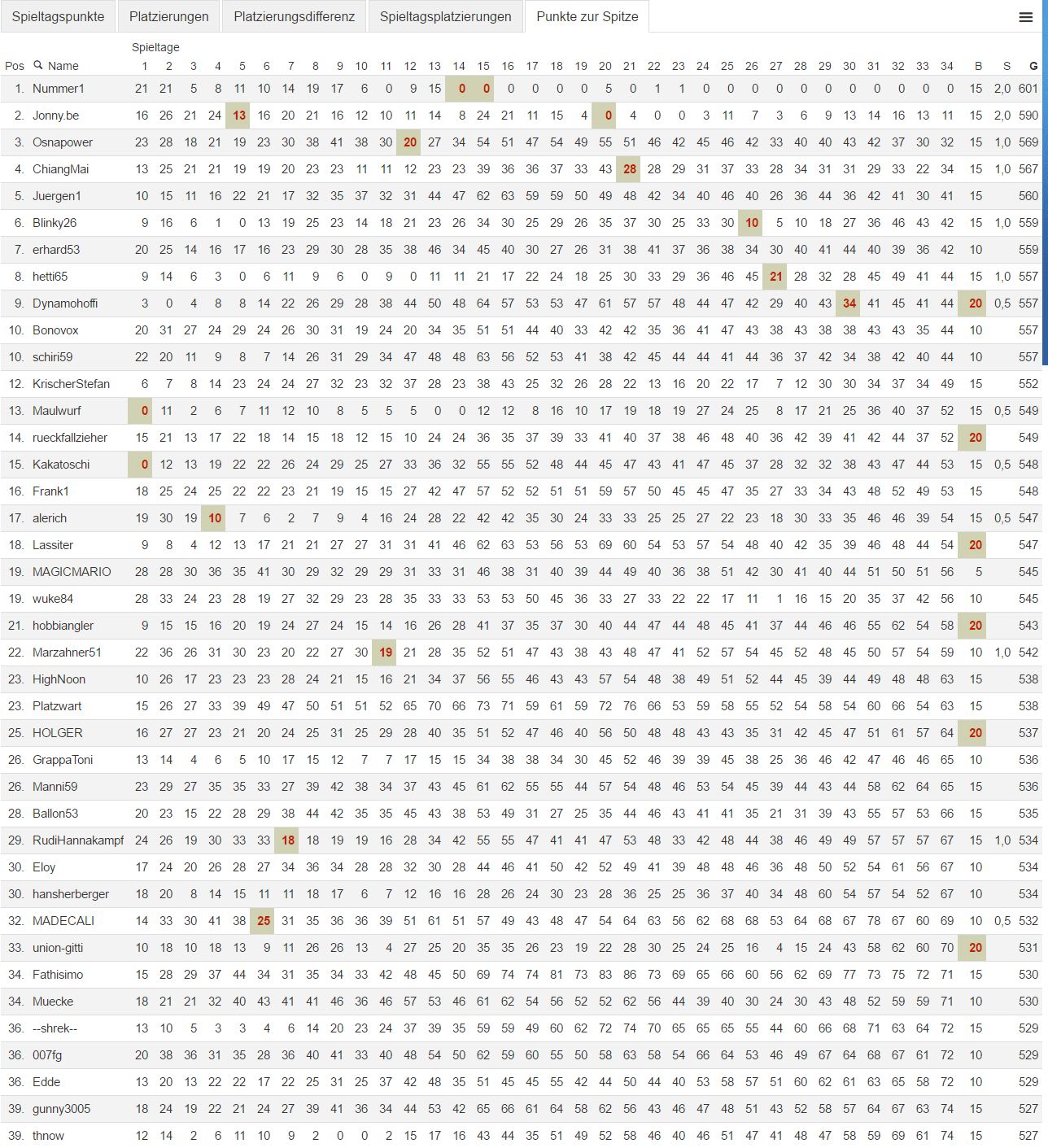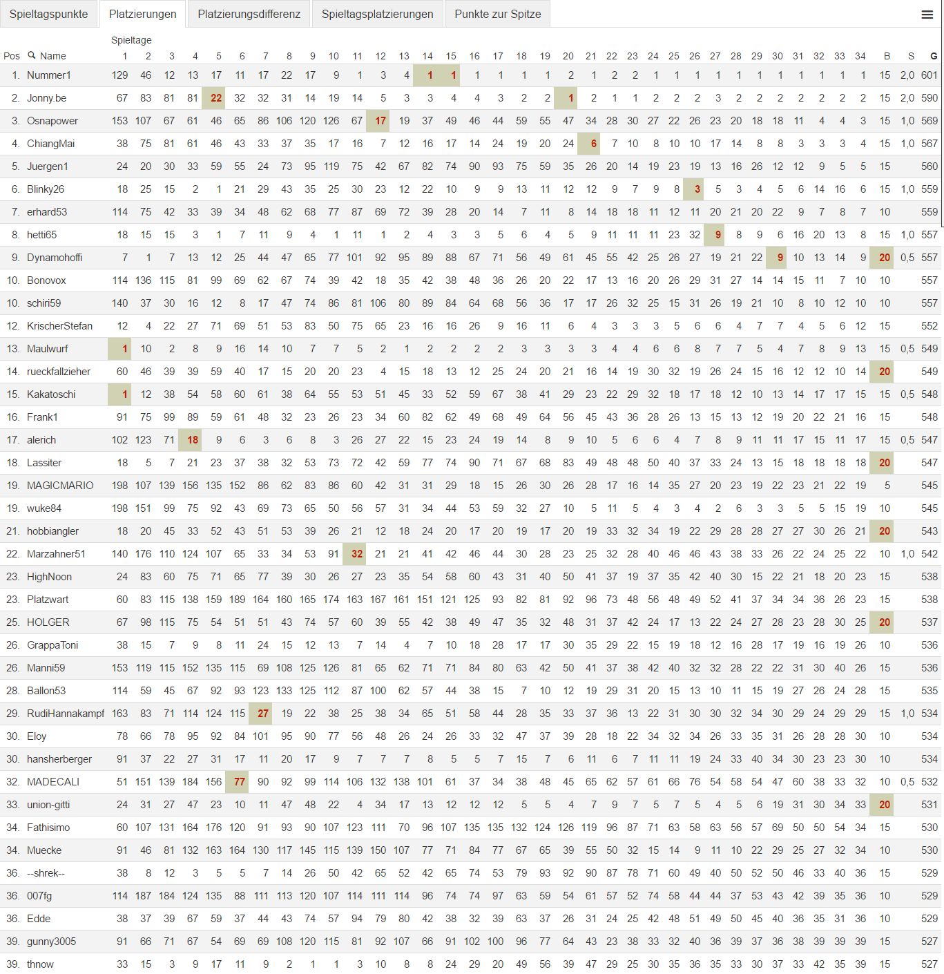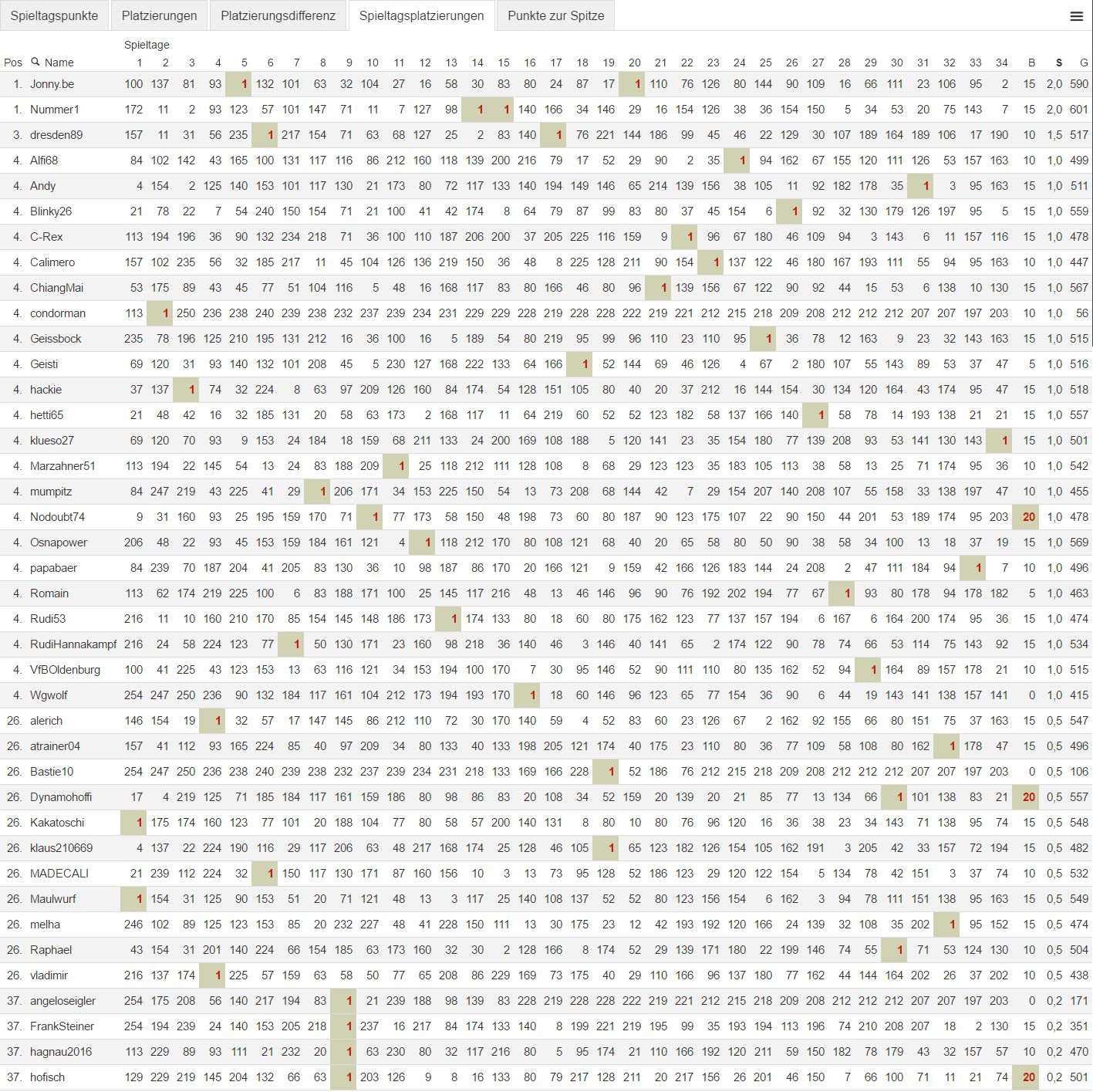 Spieltagplatzierungen (Platzierung nach Siegpunkten)