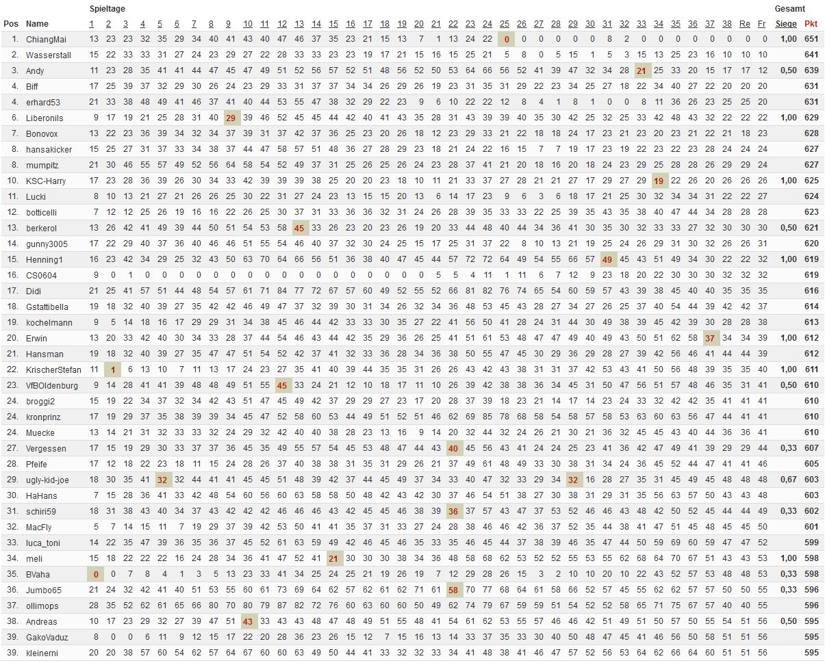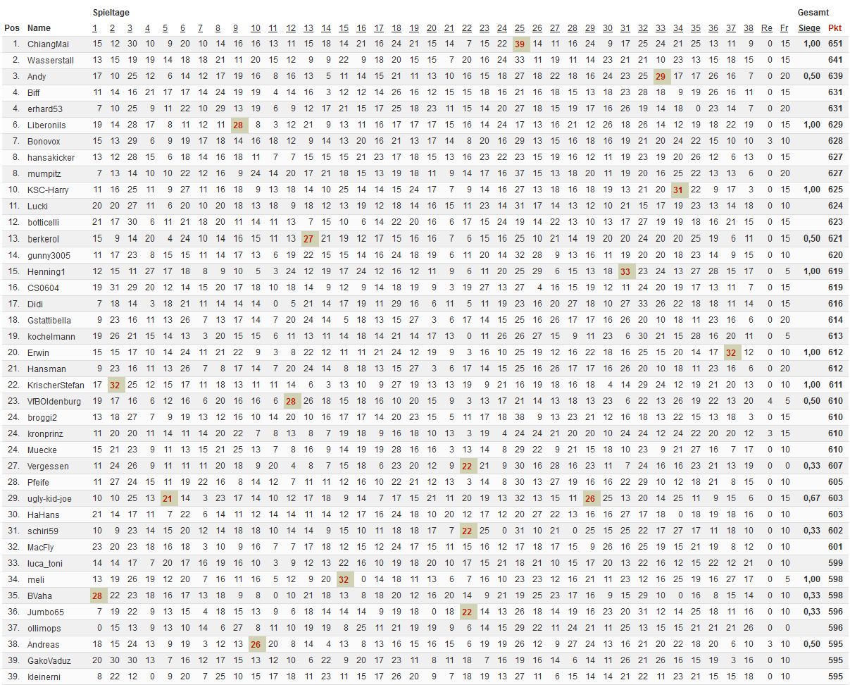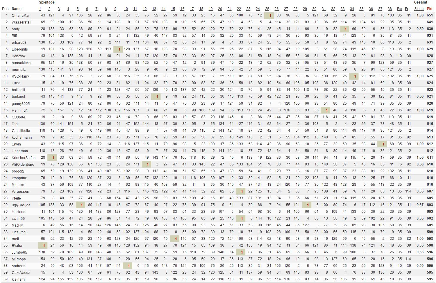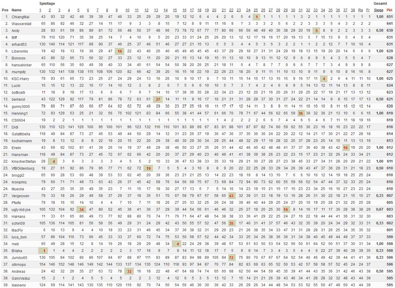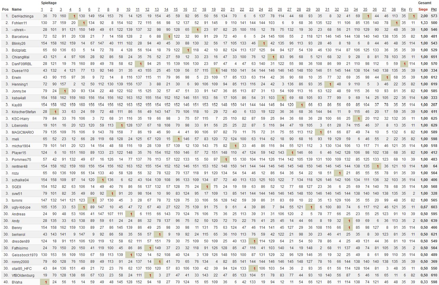 Spieltagplatzierungen (Platzierung nach Siegpunkten)